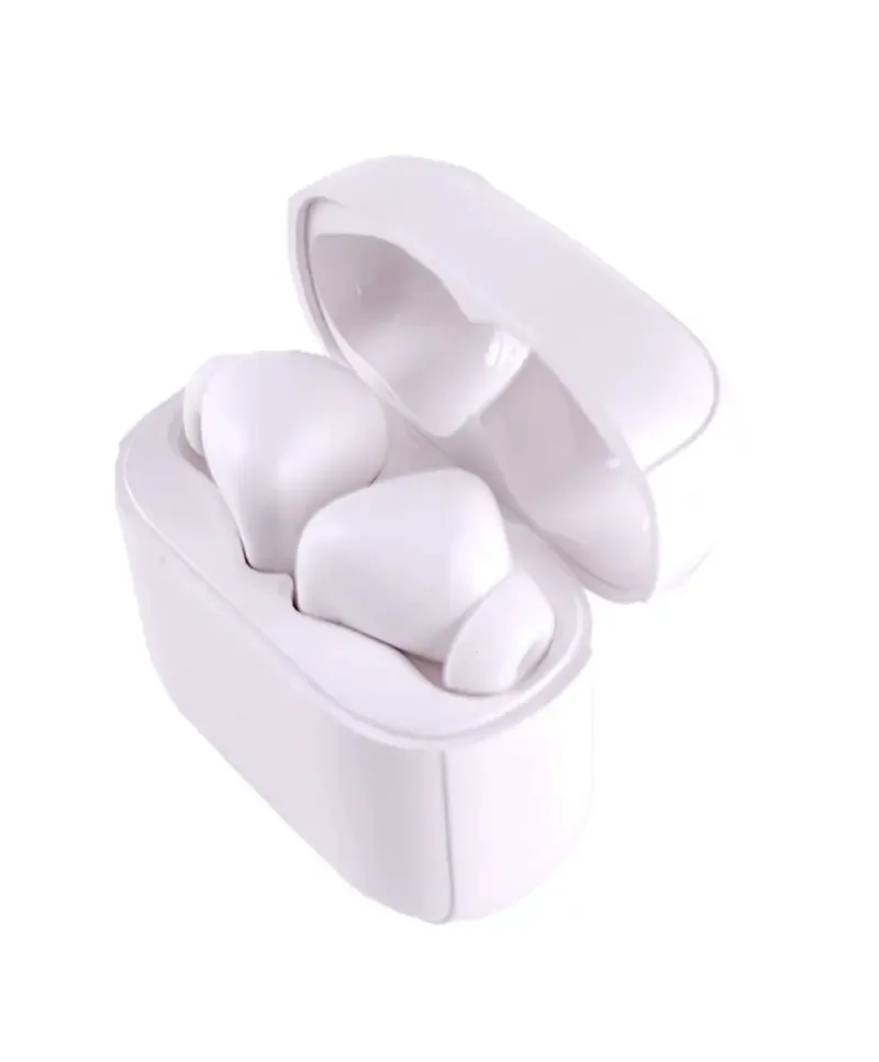 Auriculares inalámbricos fabricados en ABS reciclado. Cada auricular cuenta con un botón touch que permite contestar y finalizar llamadas, reproducir y pausar música, cambiar a la siguiente o anterior canción.