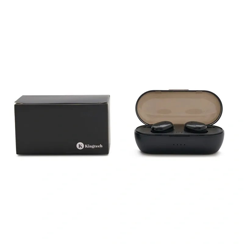 Auriculares inalámbricos con estuche de carga y micrófono incorporado. Posee tecnología bluetooth 5.0. Capacidad del auricular es de 55mAh y su capacidad de carga es de 300mAh. Cuenta con cobertura bluetooth en una distancia de 10 metros y su duración en funcionamiento es de 3 horas seguidas. Mantiene la carga sin uso por 120 horas y el tiempo de carga es de 50 minutos. Funciones touch: un toque para pausar/reproducir música, dos toques para redial. Medidas: 8 x 3,5 cm. Kingtech.