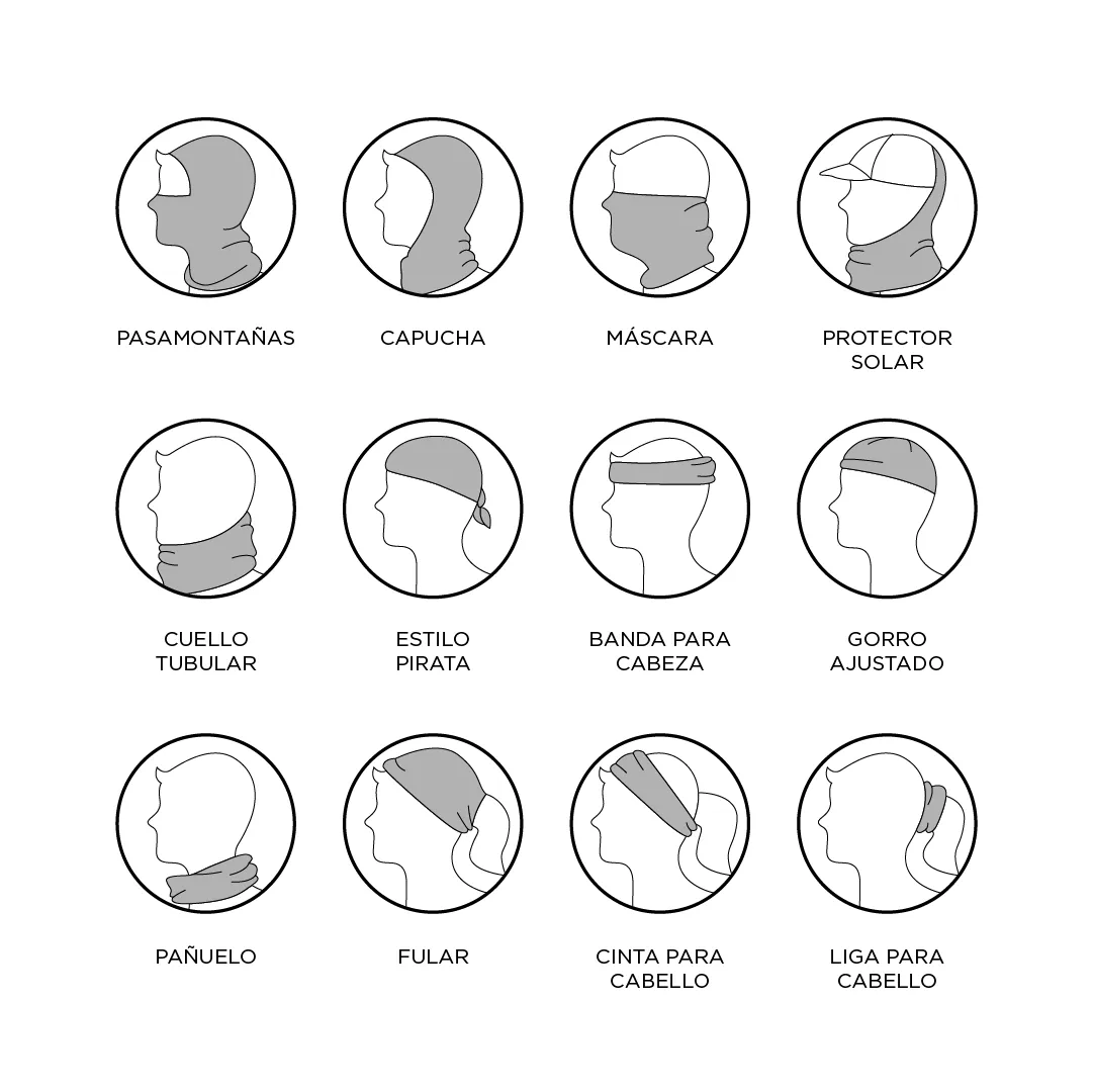 Se puede usar como ropa informal o al aire libre, donde ofrece protección contra el sol, el viento, el polvo y los insectos en verano y mantiene el cuello y la cabeza calientes en invierno. Se puede usar como gorro, gorra estilo pirata, fular, forro de casco, polaina para el cuello, pasamontañas, protector contra el polvo, bufanda, bandana o muñequera.