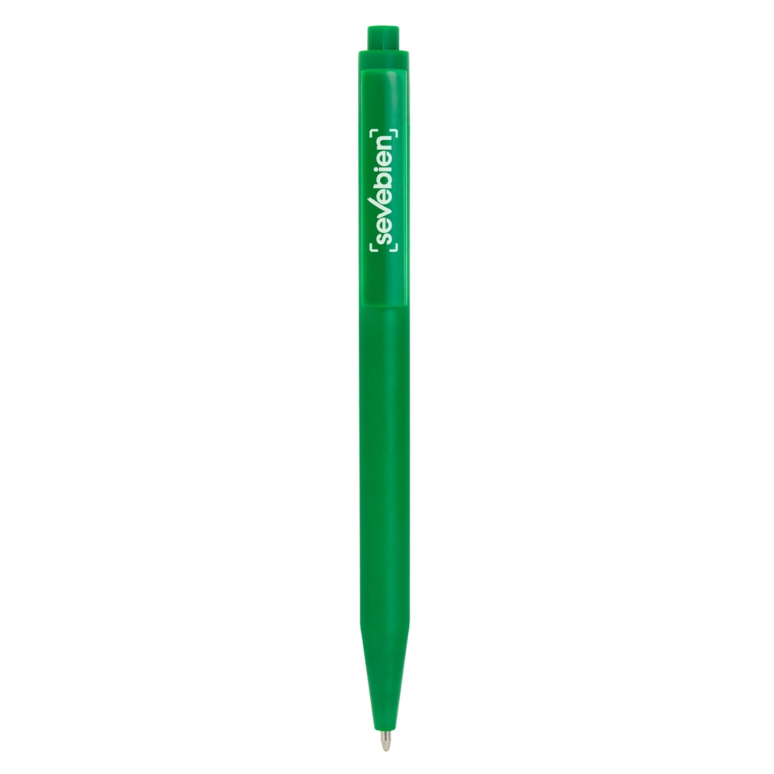 Plástico ABS. Bolígrafo retráctil. Cuerpo y clip plásticos del mismo color, cuerpo acabado mate y clip acabado brillante. Tinta negra. Amplia área de impresión.