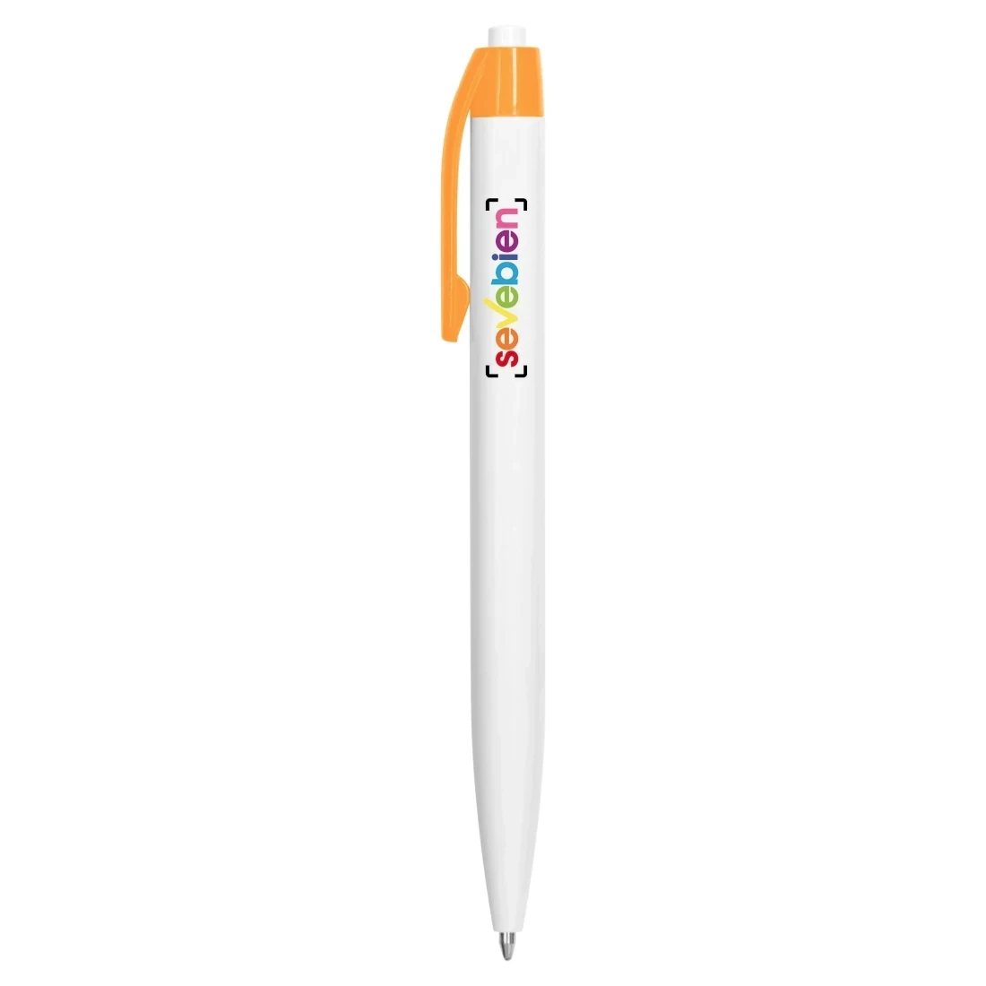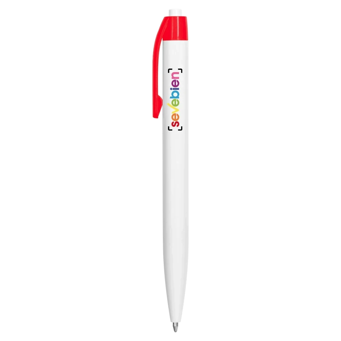 Plástico. Bolígrafo con cuerpo y pulsador de color blanco y clip en color. Tinta negra.