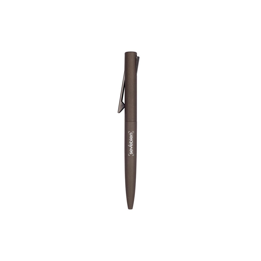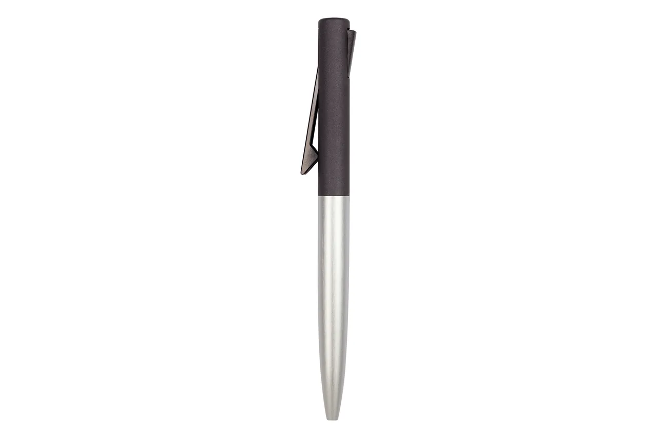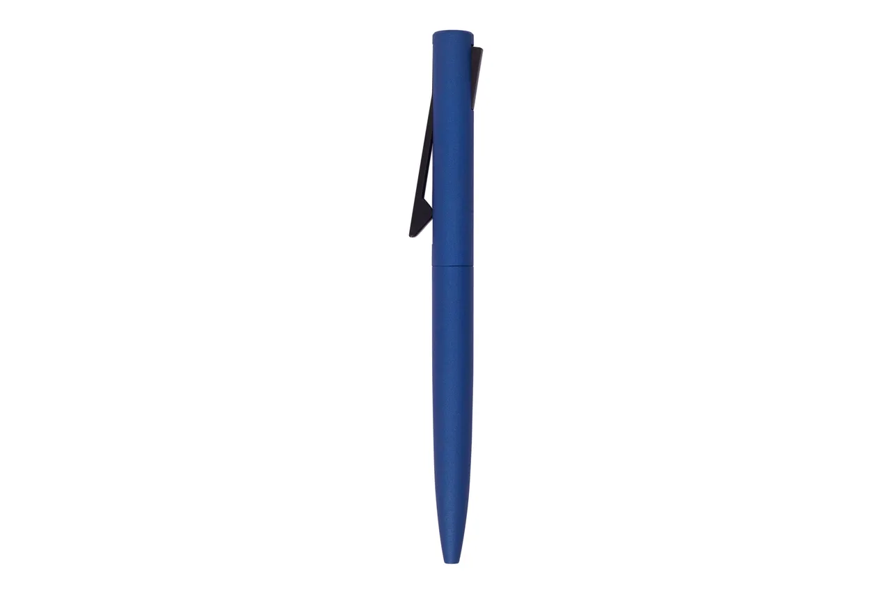 Metal. Cuerpo en metal, parte superior plástica con detalle de color negro. El clip funciona como pulsador. Ideal para imprimir en tampografia. Tinta azul.