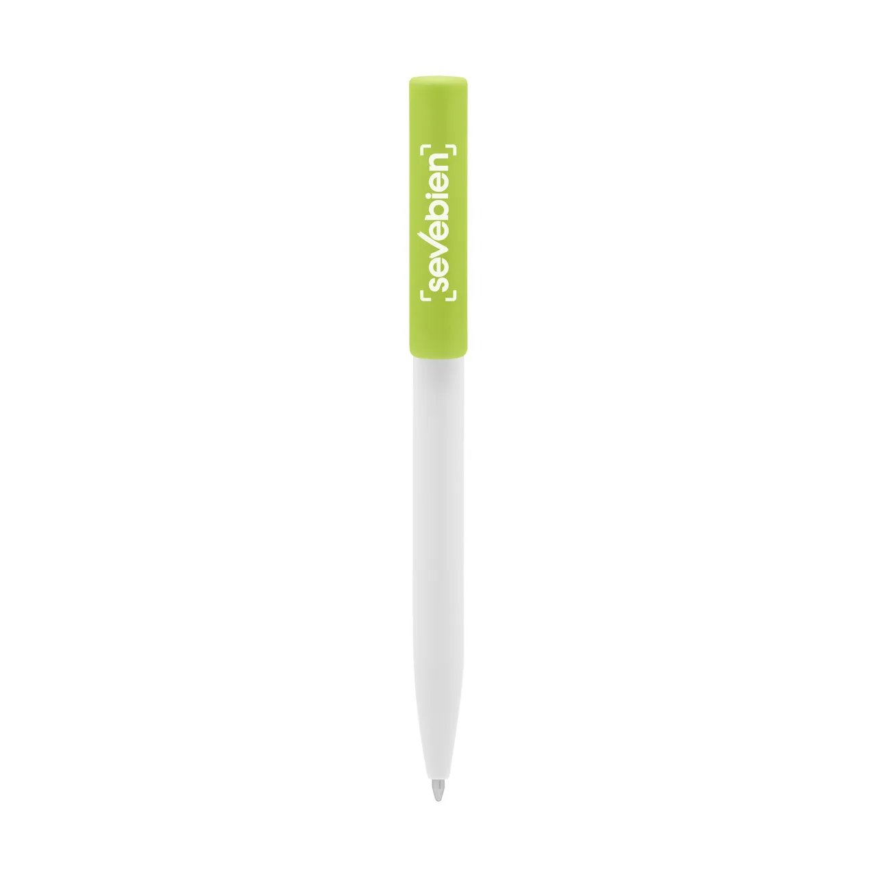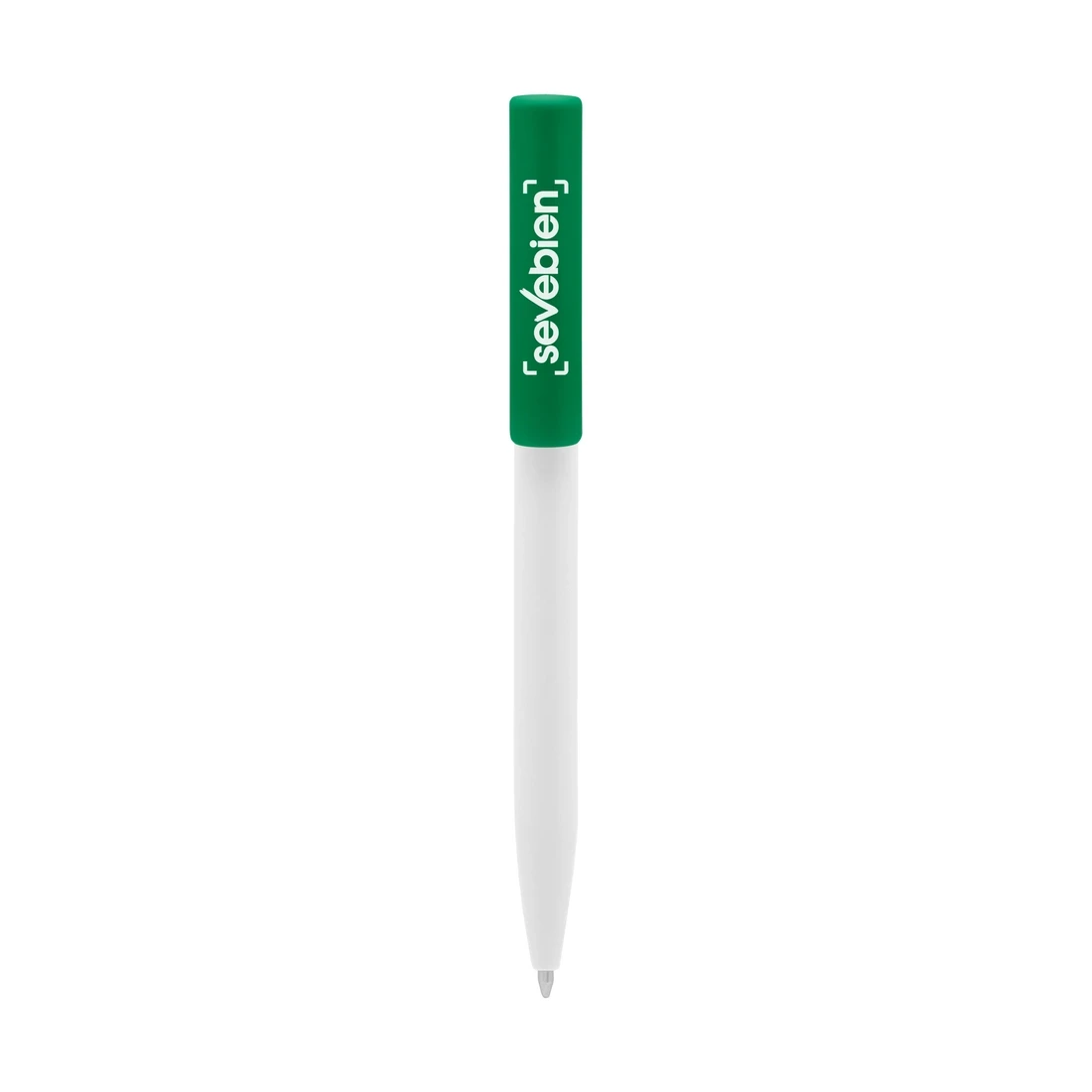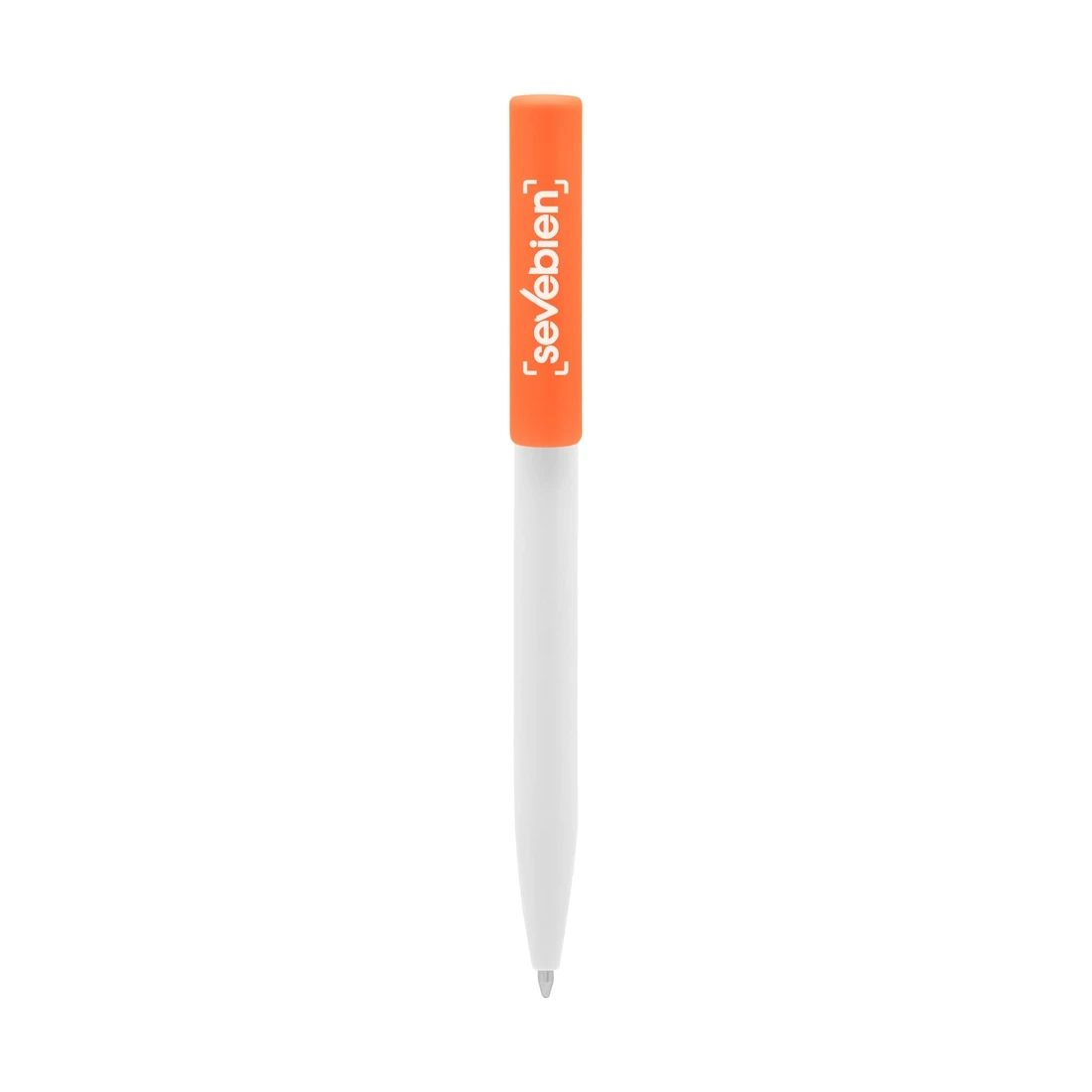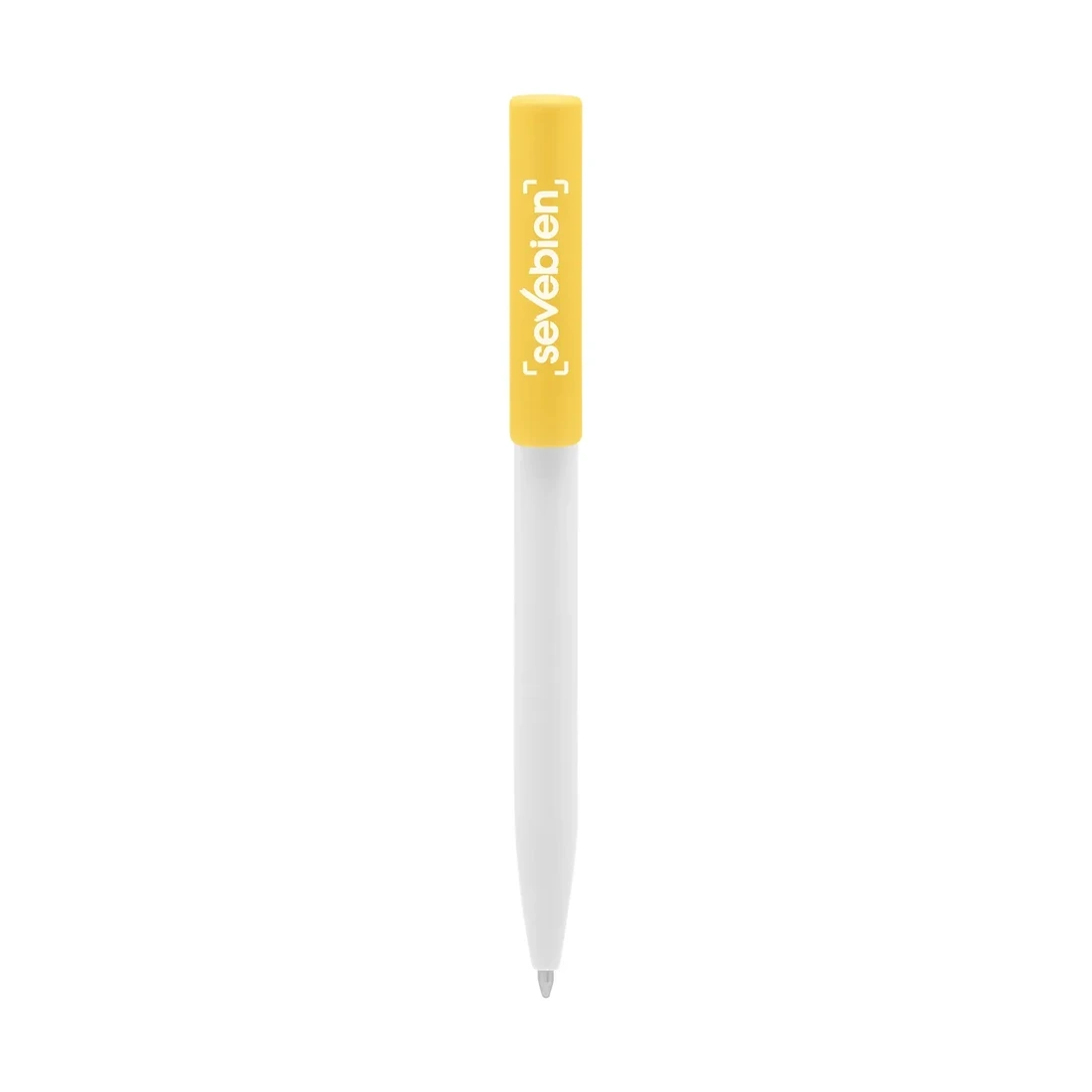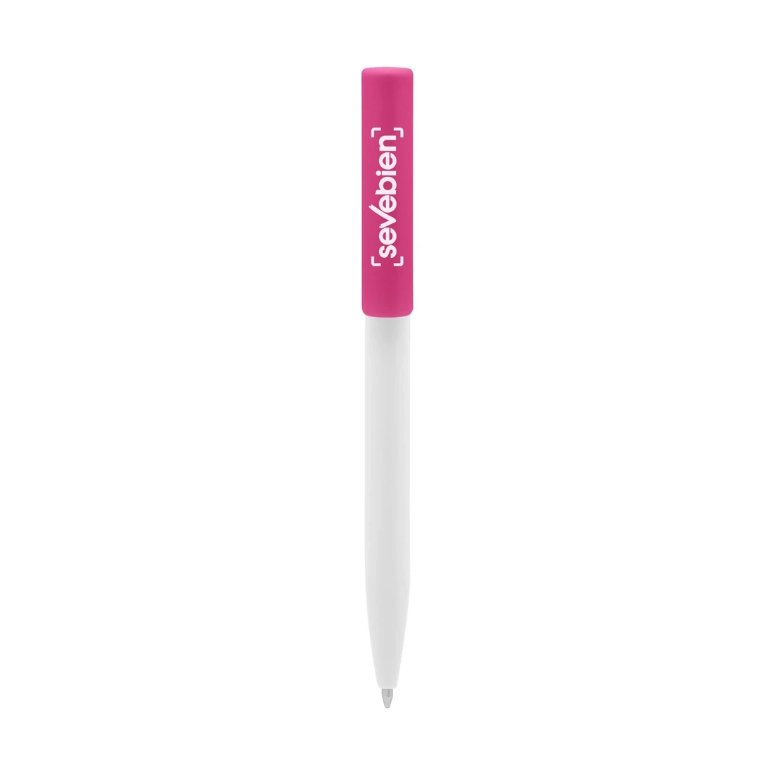 Plástico. Cuerpo blanco y clip de diferentes colores. Bolígrafo retráctil. Clip plástico de colores. Tinta negra. Sistema de botón push para destapar. Amplia área de impresión.