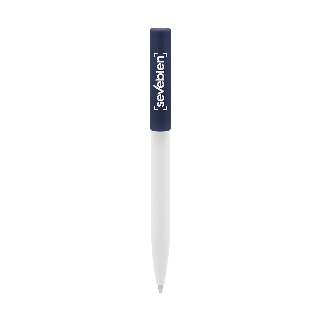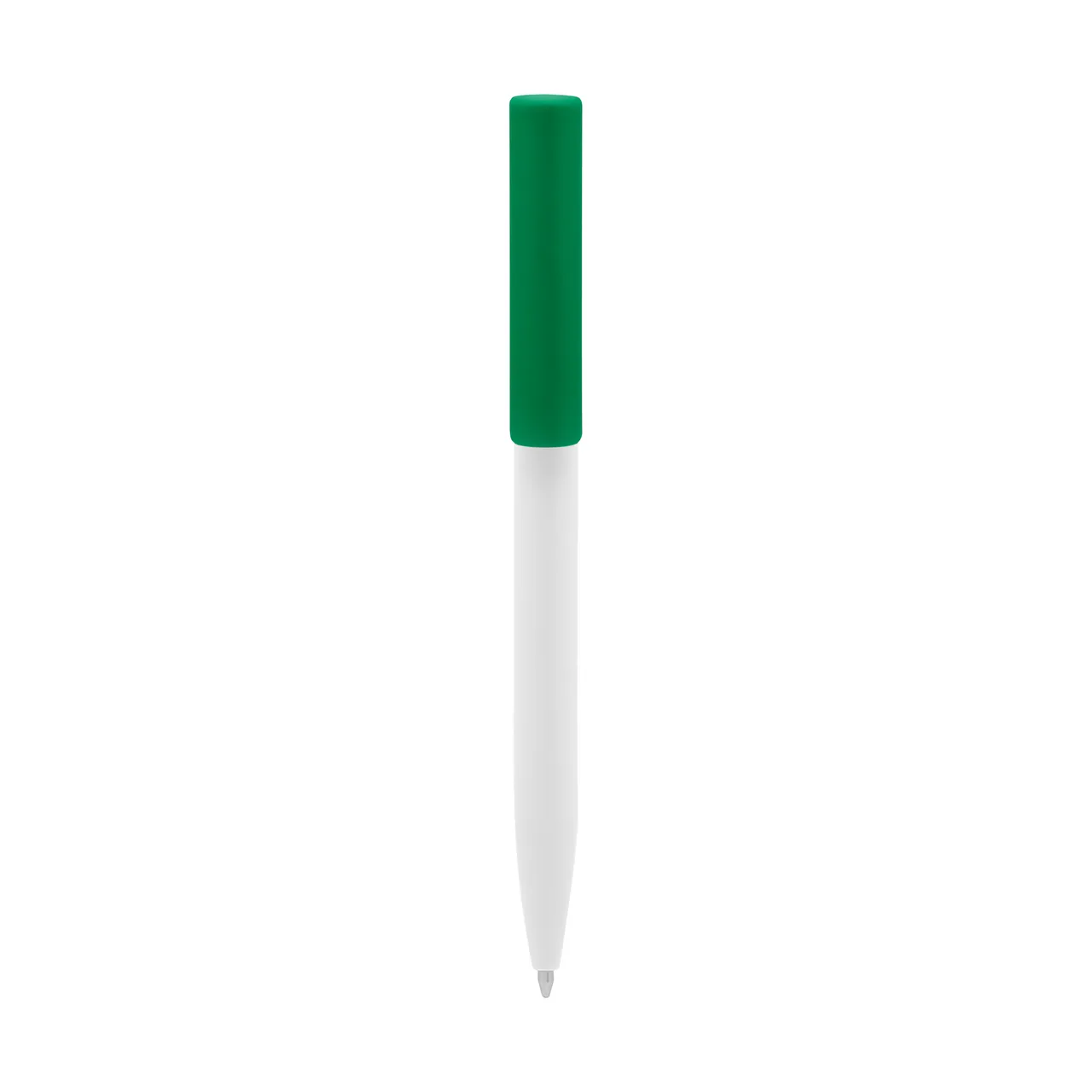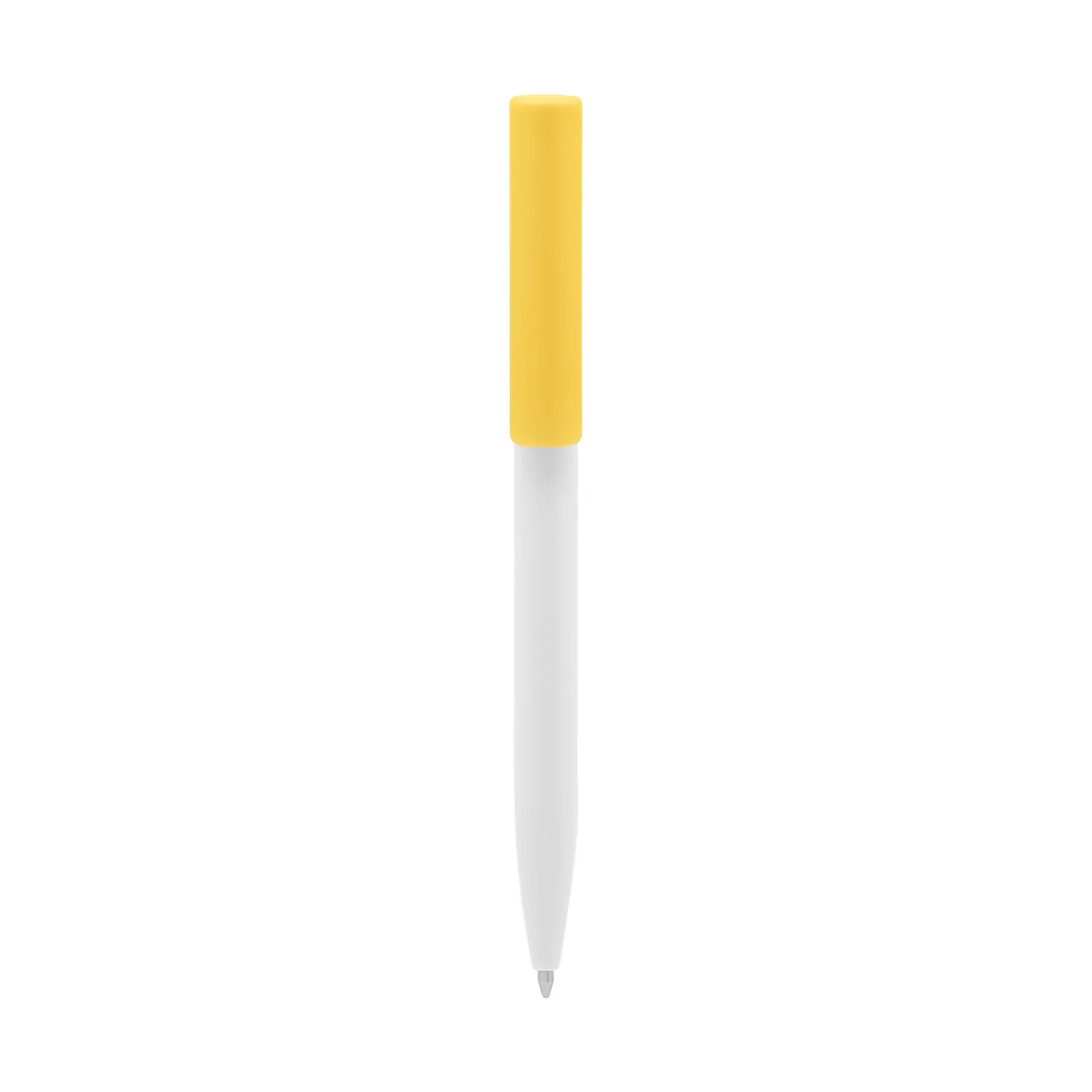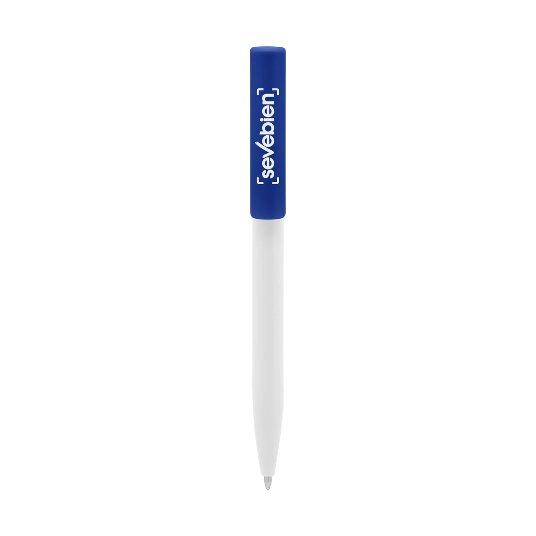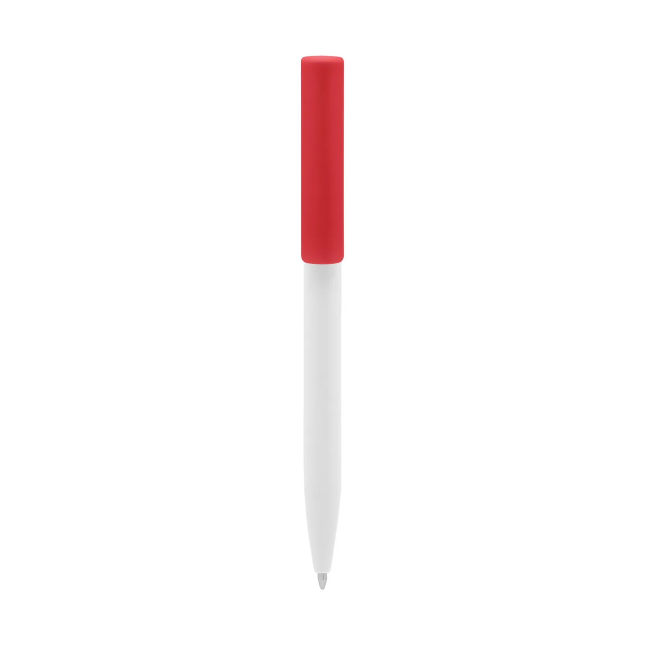 Plástico. Cuerpo blanco y clip de diferentes colores. Bolígrafo retráctil. Clip plástico de colores. Tinta negra. Sistema de botón push para destapar. Amplia área de impresión.