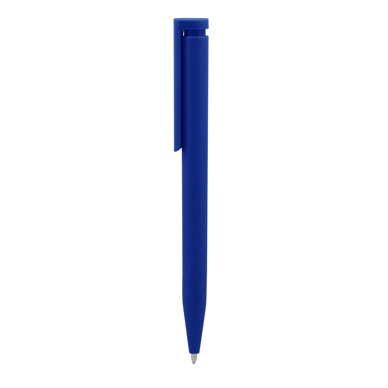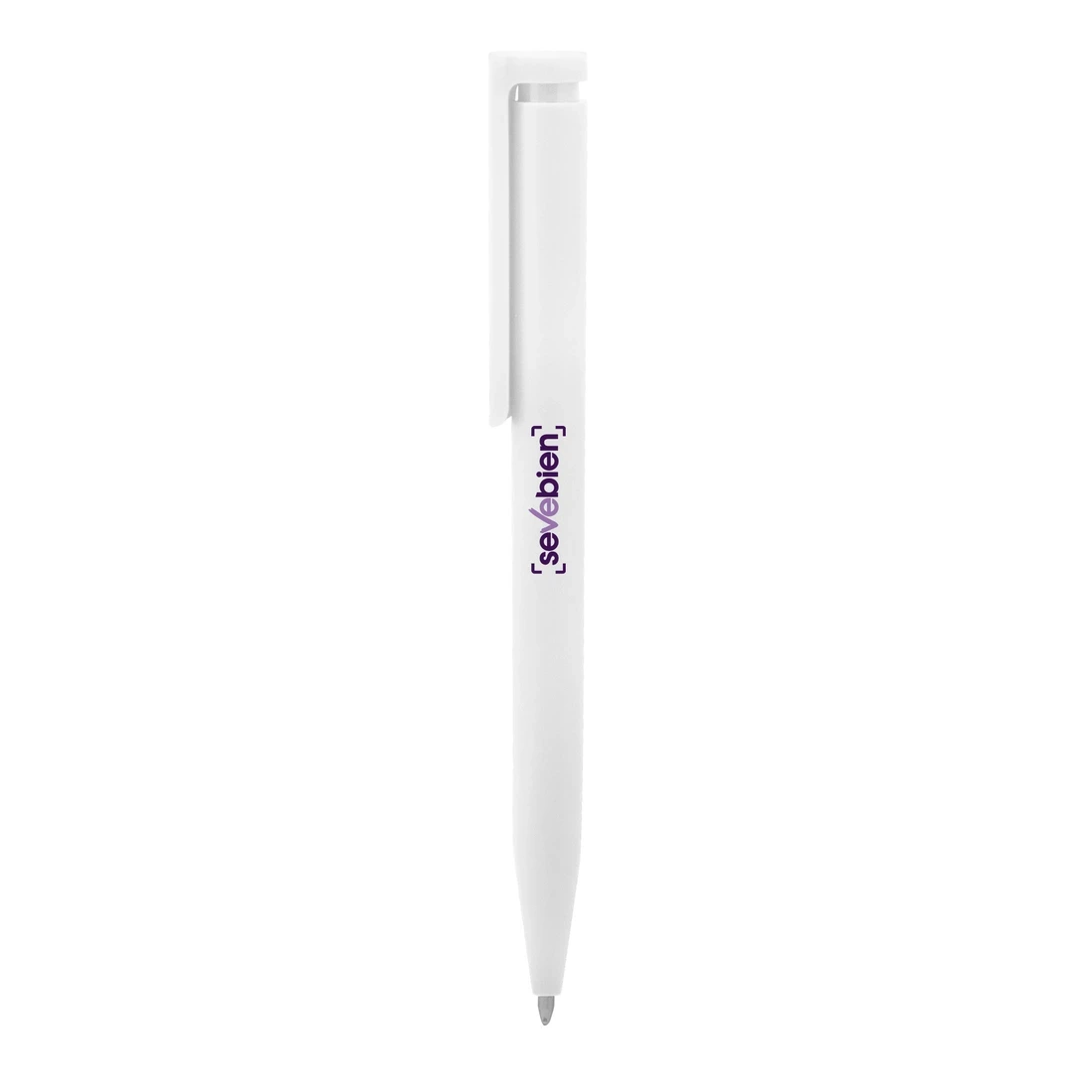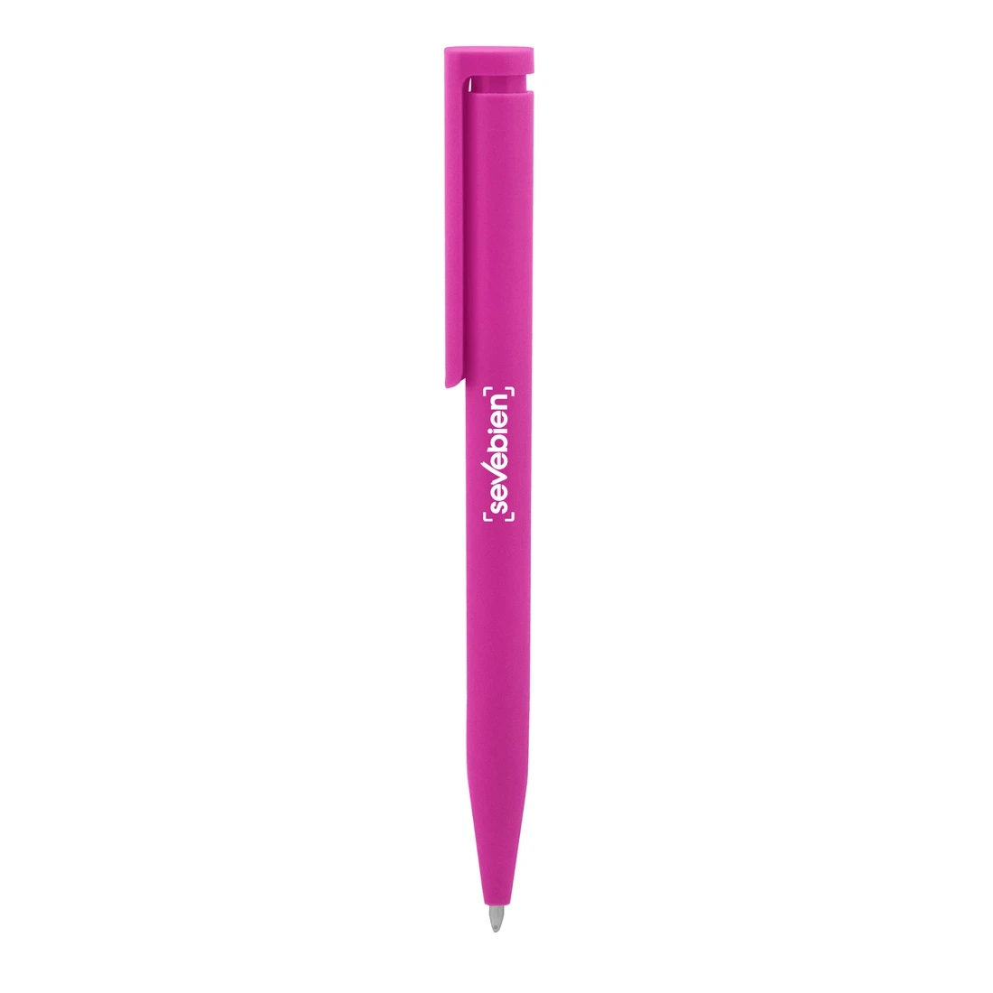 Plástico. Cuerpo de diferentes colores. Bolígrafo retráctil. Clip plástico del mismo color del cuerpo. Tinta negra. Sistema de botón push para destapar. Amplia área de impresión.