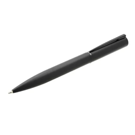 Diseño elegante para quienes valoran calidad y sostenibilidad.Bolígrafo con apertura giratoria. Cuerpo metálico en negro mate. Cuerpo de aluminio reciclado. Destape electroplateado en cobre en la parte superior. Recarga metálica. Clip y anillos metálicos color gold rose.