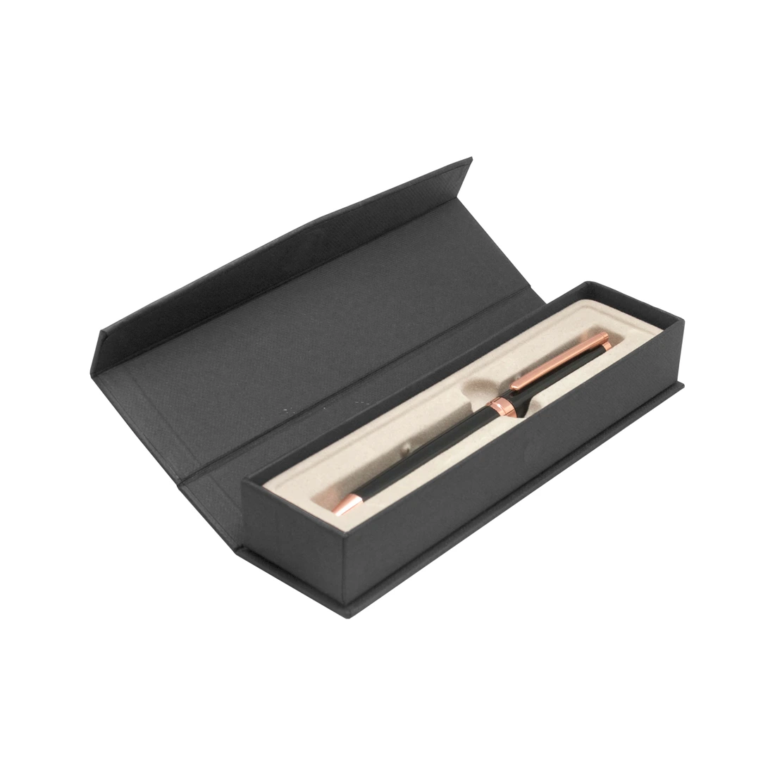 Metálico. Bolígrafo con apertura giratoria. Destape cobre en la parte de arriba. Cuerpo negro. Detalles en clip, arco circular y punta color cobre. Tinta negra. Presentación en estuche con cierre magnético.