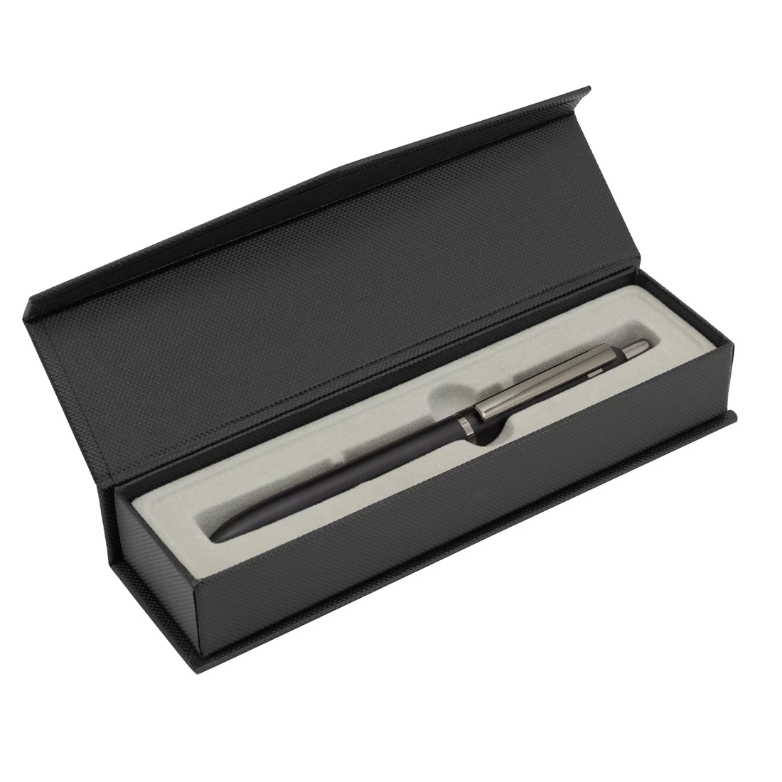 Metal. Cuerpo de aluminio. Bolígrafo retráctil. Clip, botón y anillos metálicos color plata. Tinta Negra. Destape electroplateado en ambas partes. Presentación en estuche con cierre magnético.