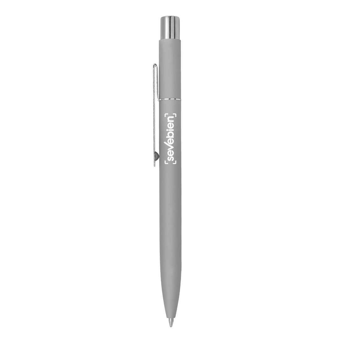 Metal. Cuerpo de aluminio, acabado engomado en diferentes colores, muy suave al tacto. Bolígrafo retráctil. Clip, pulsador y anillo metálicos color plata. Tinta negra. Destape al grabar color plata.