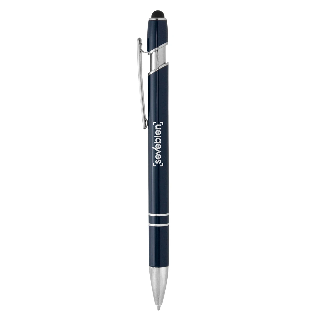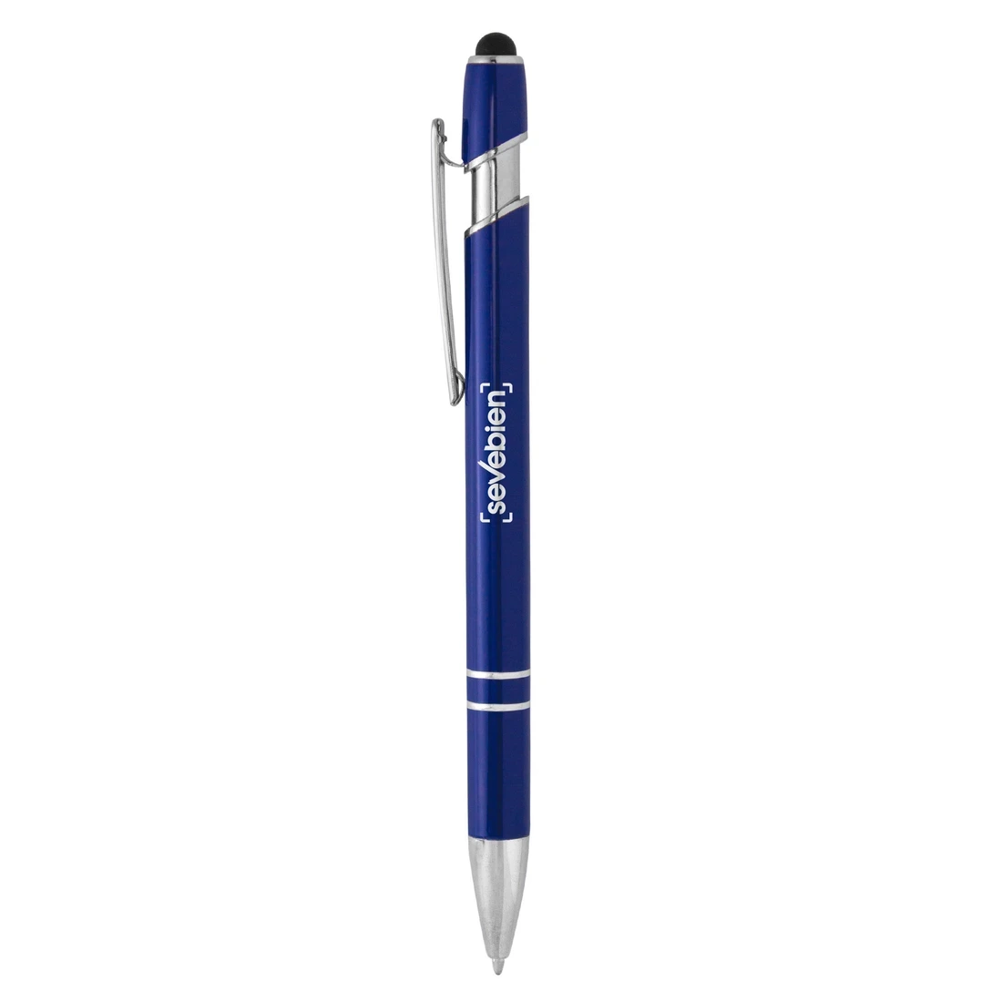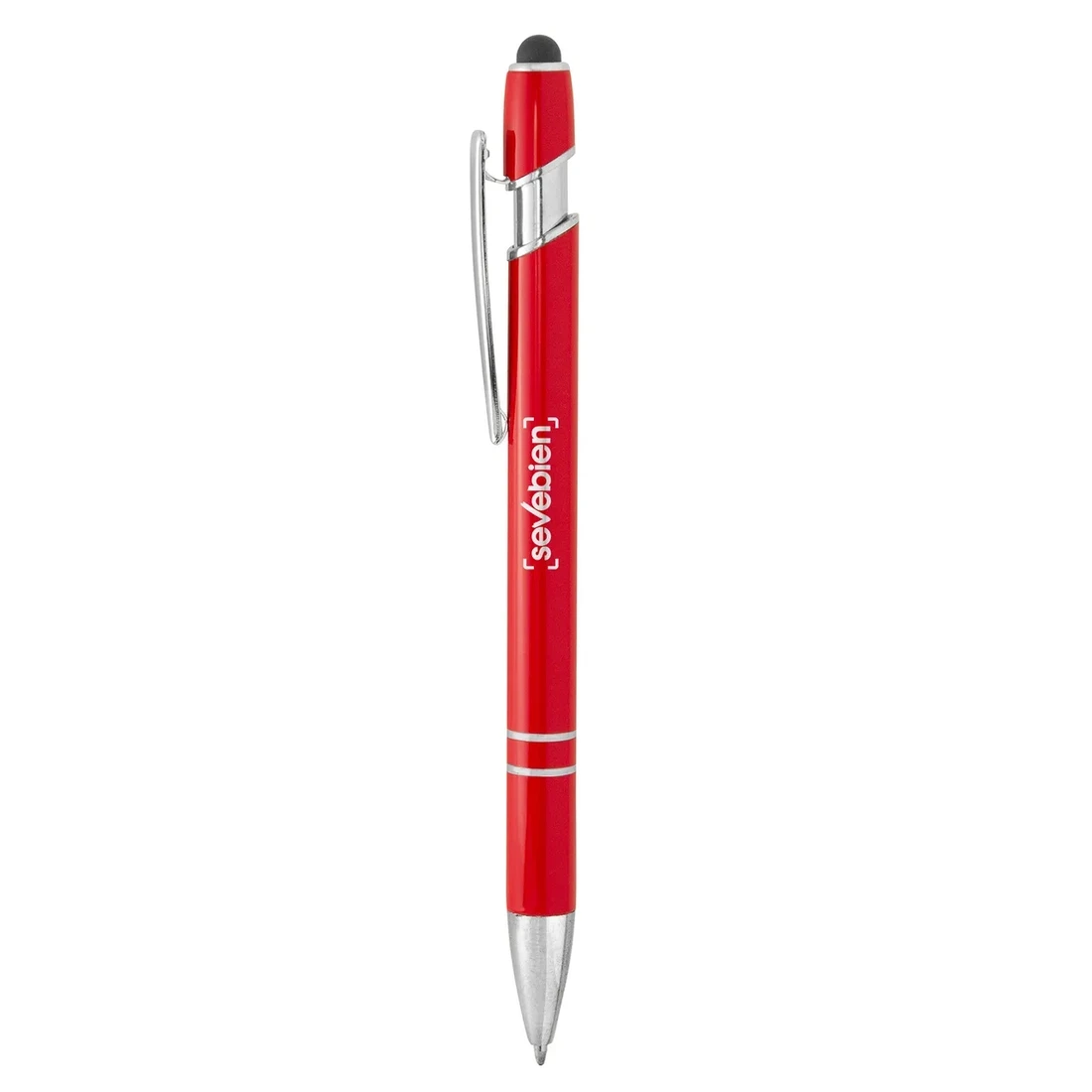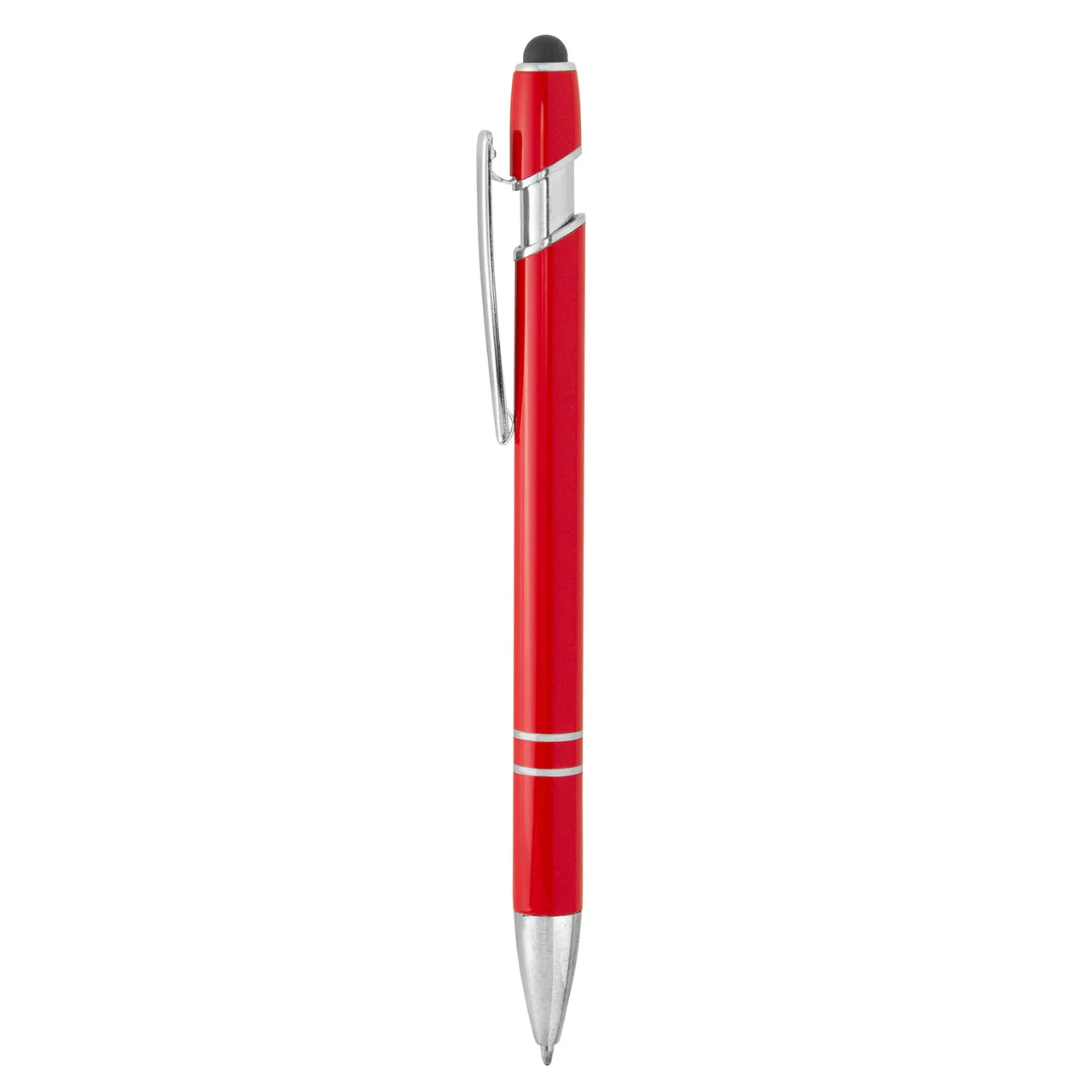 Metálico. Bolígrafo retráctil con pulsador touch. Cuerpo de aluminio de diferentes colores con acabado laca. Puntera, anillos, clip y detalles del pulsador en plateado brillante.
