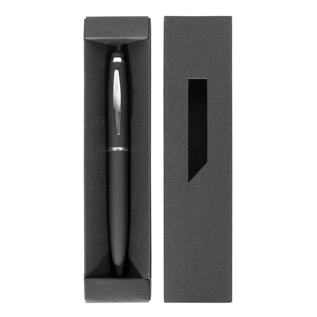 Metal. Cuerpo color negro engomado. Puntera touch y apertura giratoria. Cuenta con detalles color plata. Tinta negra. Decapa plata. Presentación en caja de regalo.