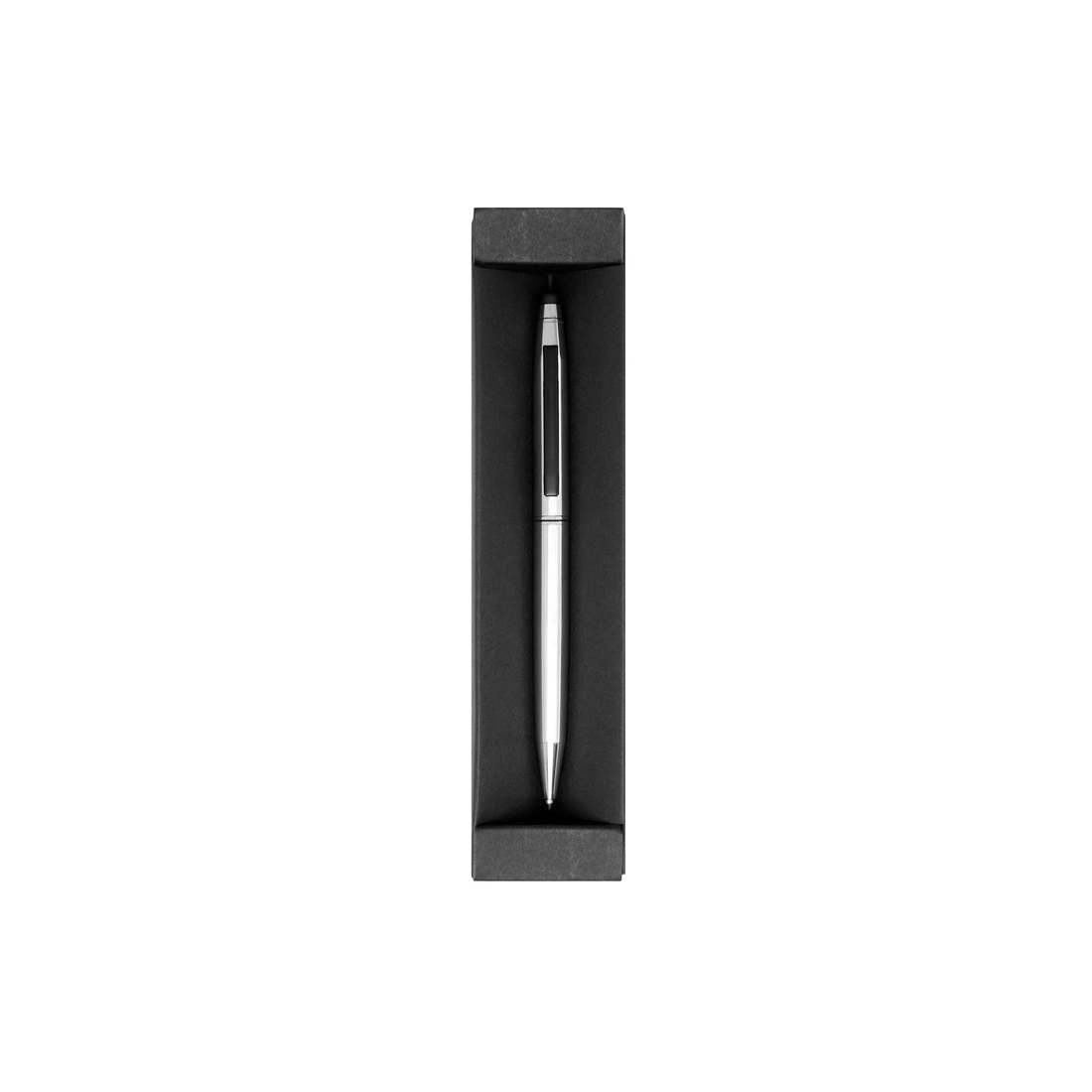 Metálico. Cuerpo color plata. Clip color negro mate, apertura giratoria con puntera touch. Cartucho metálico. Tinta negra. Estuche de cartón. Decape cobrizo claro. Presentación en caja de regalo.