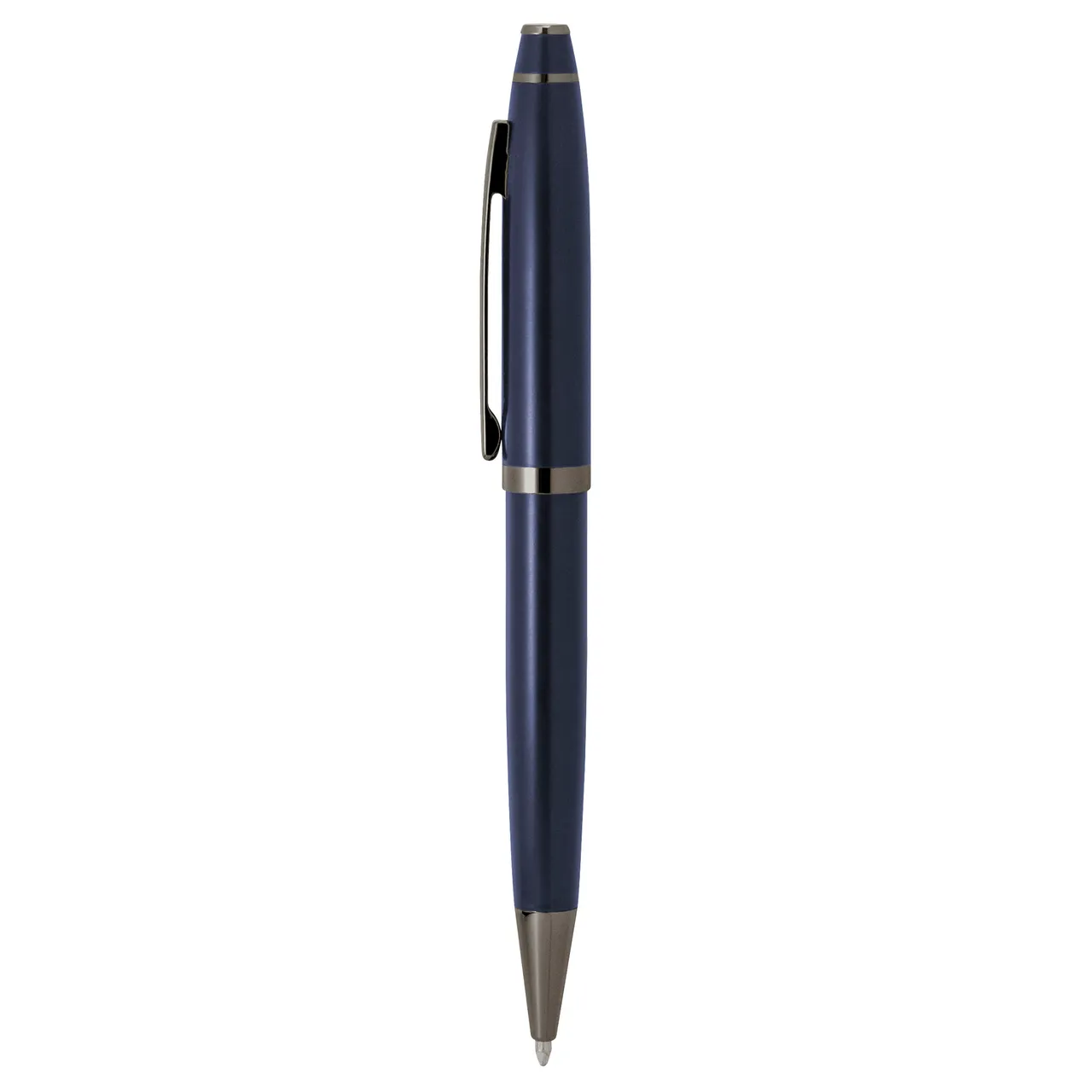 Cada detalle comunica distinción.Bolígrafo con apertura giratoria. Cuerpo de acero inoxidable de color con acabado mate. Clip, anillos y punteras metálicos color gun. Destape plata. Recarga metálica. Medidas: 13,5 cm.