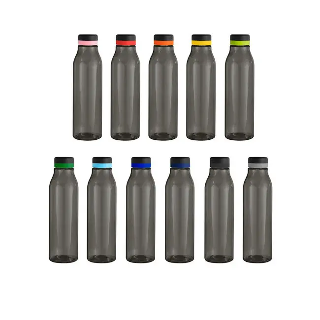 Única en su estilo.Botella de plástico color negro con tapa a rosca color negro mate con anillo de silicona de diferentes colores.Medidas: Ø 7 x 24,5 cm.