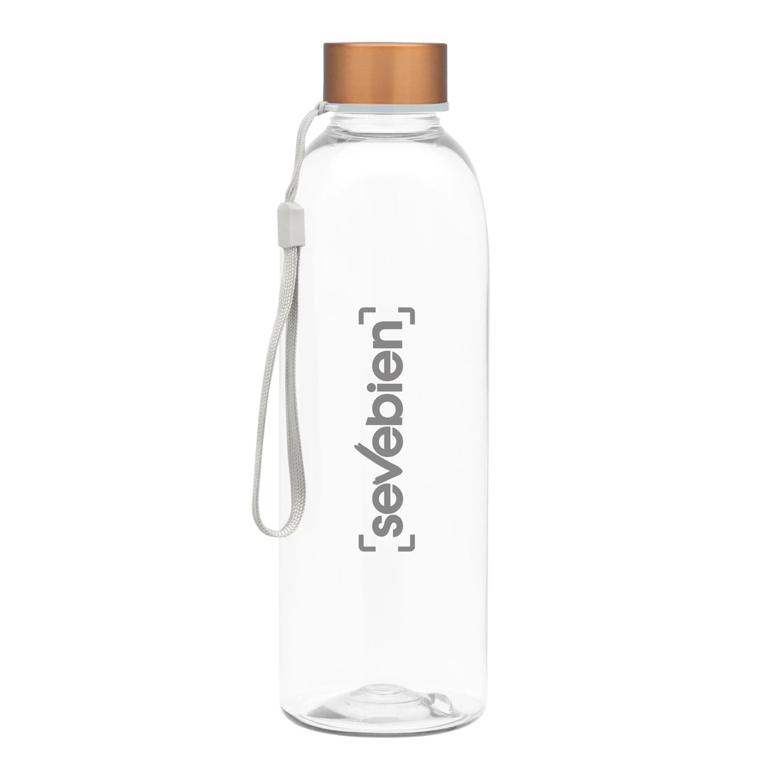Ø 7 x 23 cm. Capacidad 700 ml. Peso de la botella 70 g y de la tapa 15g. Material PET Cristalino. Botella de plástico transparente con tapa a rosca de acero inoxidable, anillo de silicona antiderrame y correa para transportar. ATENCIÓN Botella y tapa se entregan por separado. / No utilizar con bebidas gaseosas ni líquidos calientes. / El manejo de este producto es delicado. / No exponer al sol y temperaturas altas por tiempo prolongado.