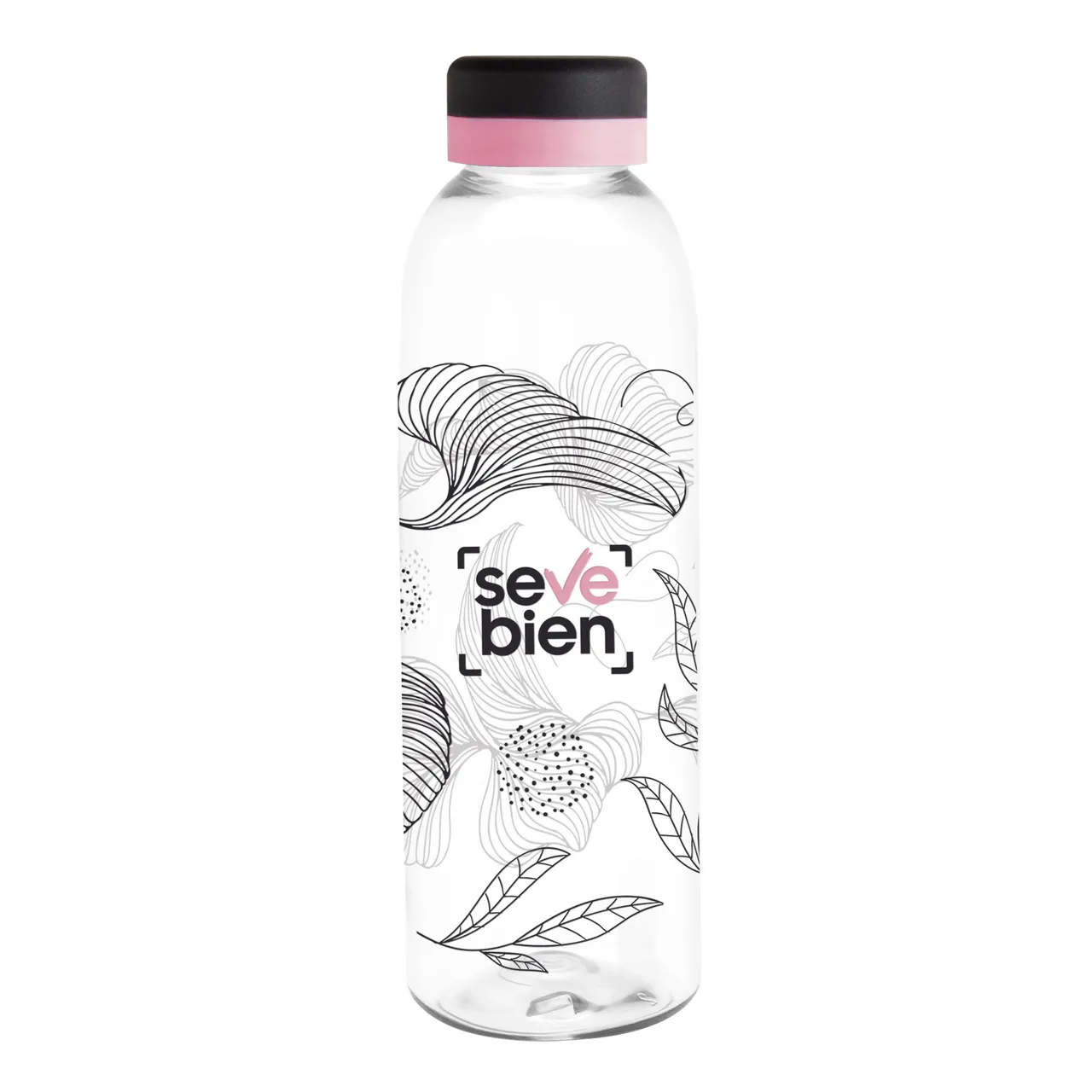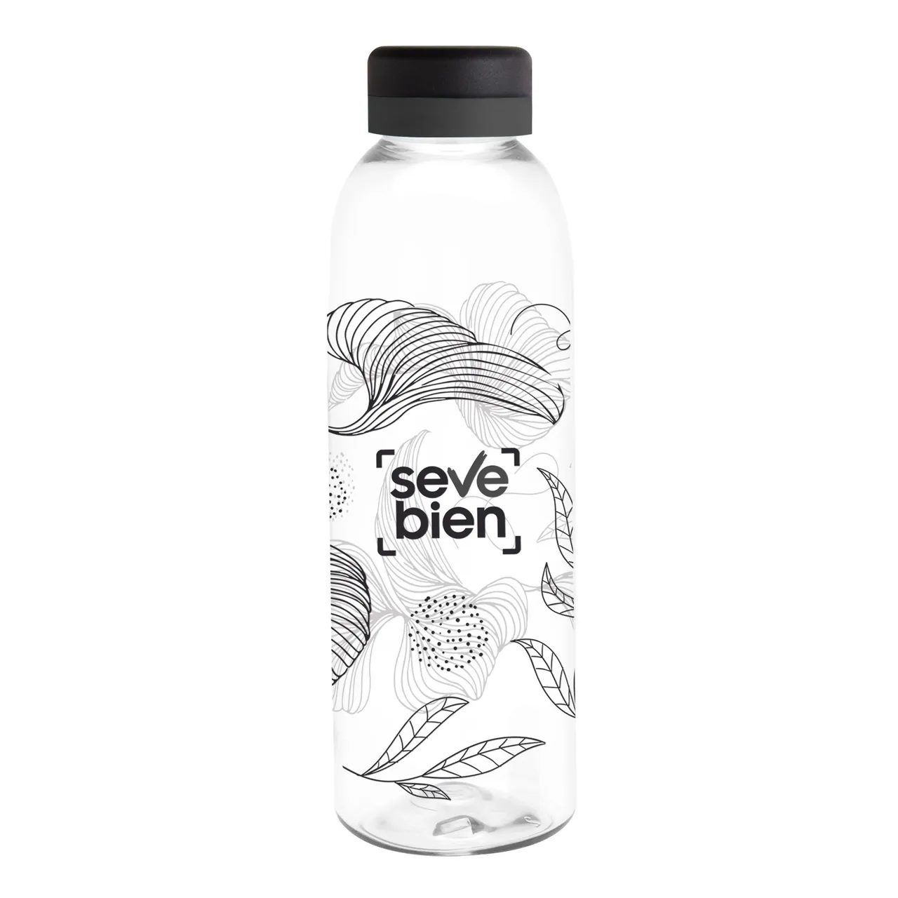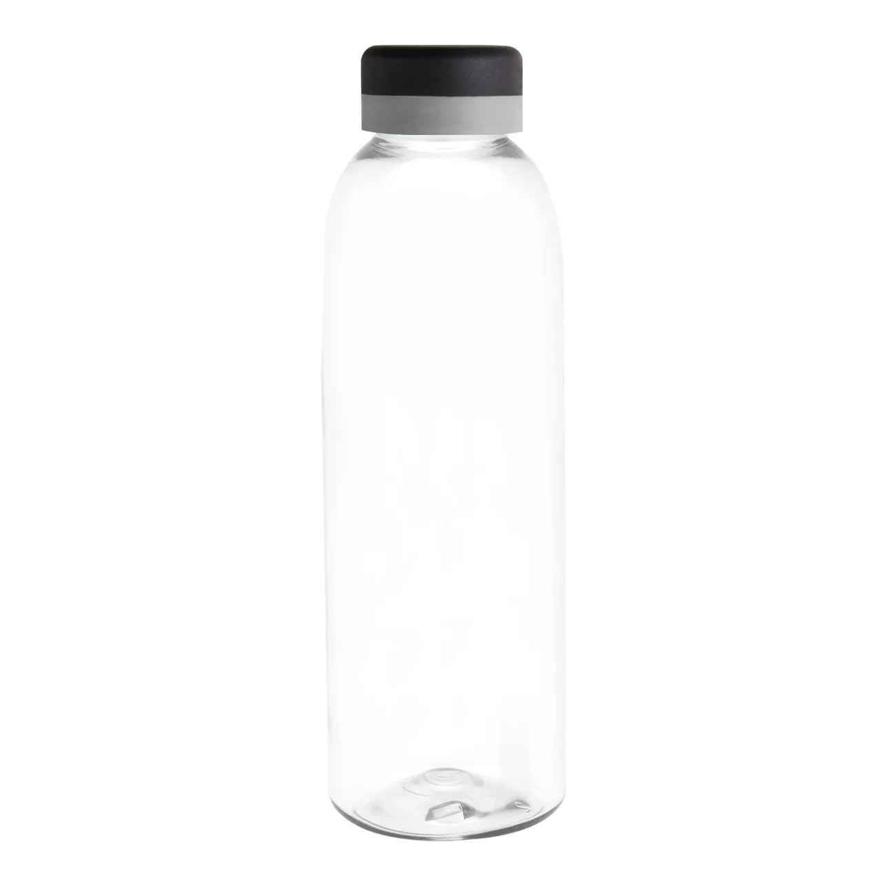Translúcida y moderna. Botella de plástico transparente con tapa a rosca color negro mate con anillo de silicona de diferentes colores.Medidas: Ø 7 x 23 cm.