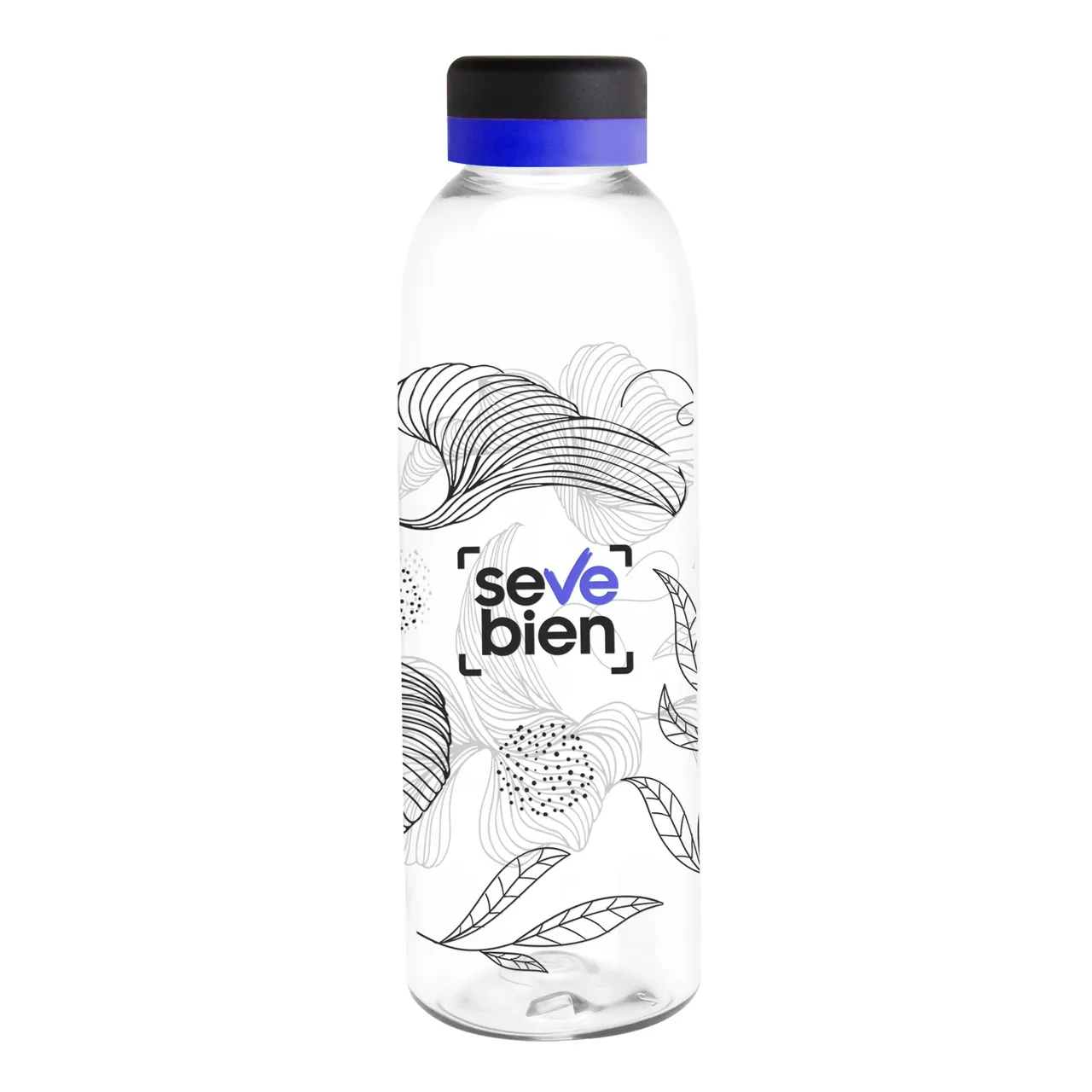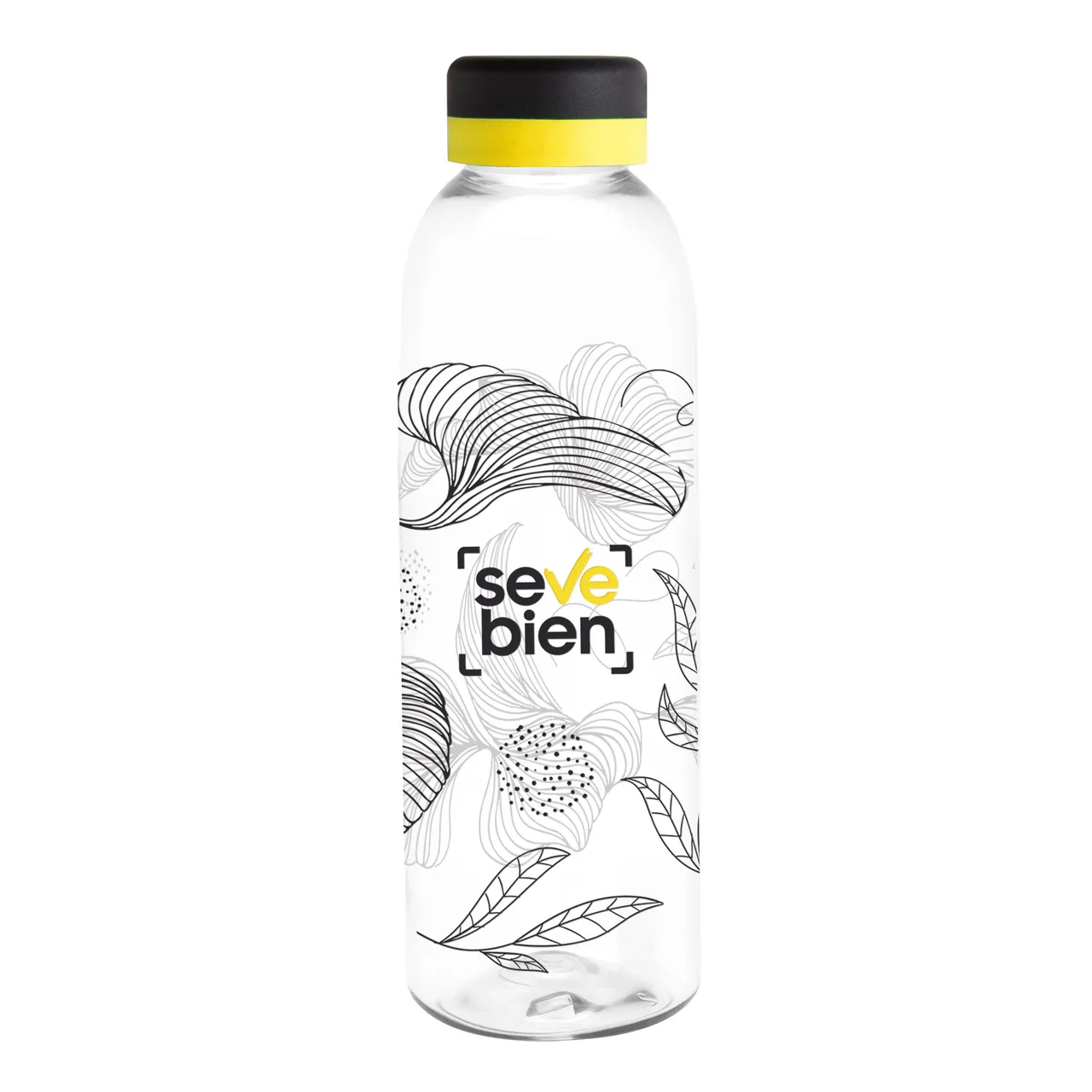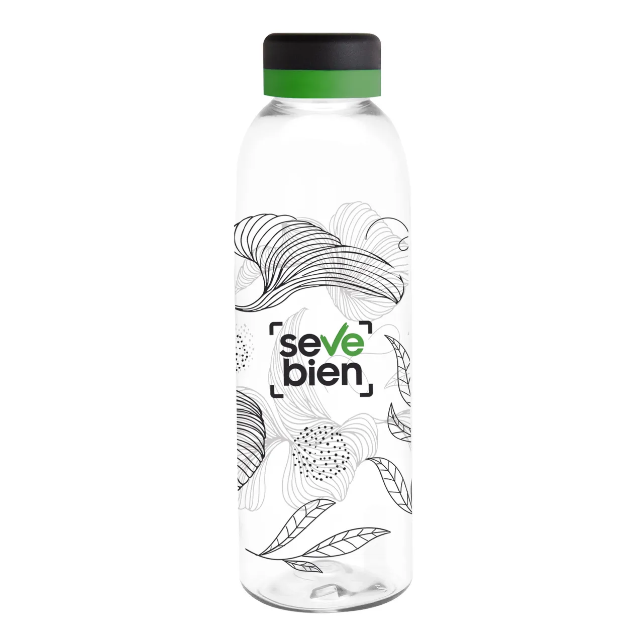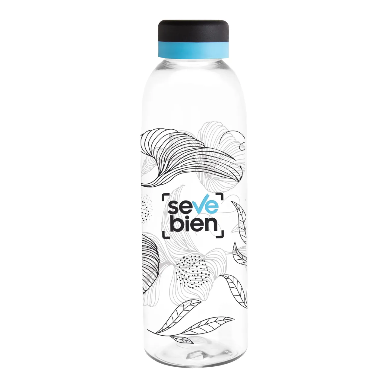 Translúcida y moderna. Botella de plástico transparente con tapa a rosca color negro mate con anillo de silicona de diferentes colores.Medidas: Ø 7 x 23 cm.