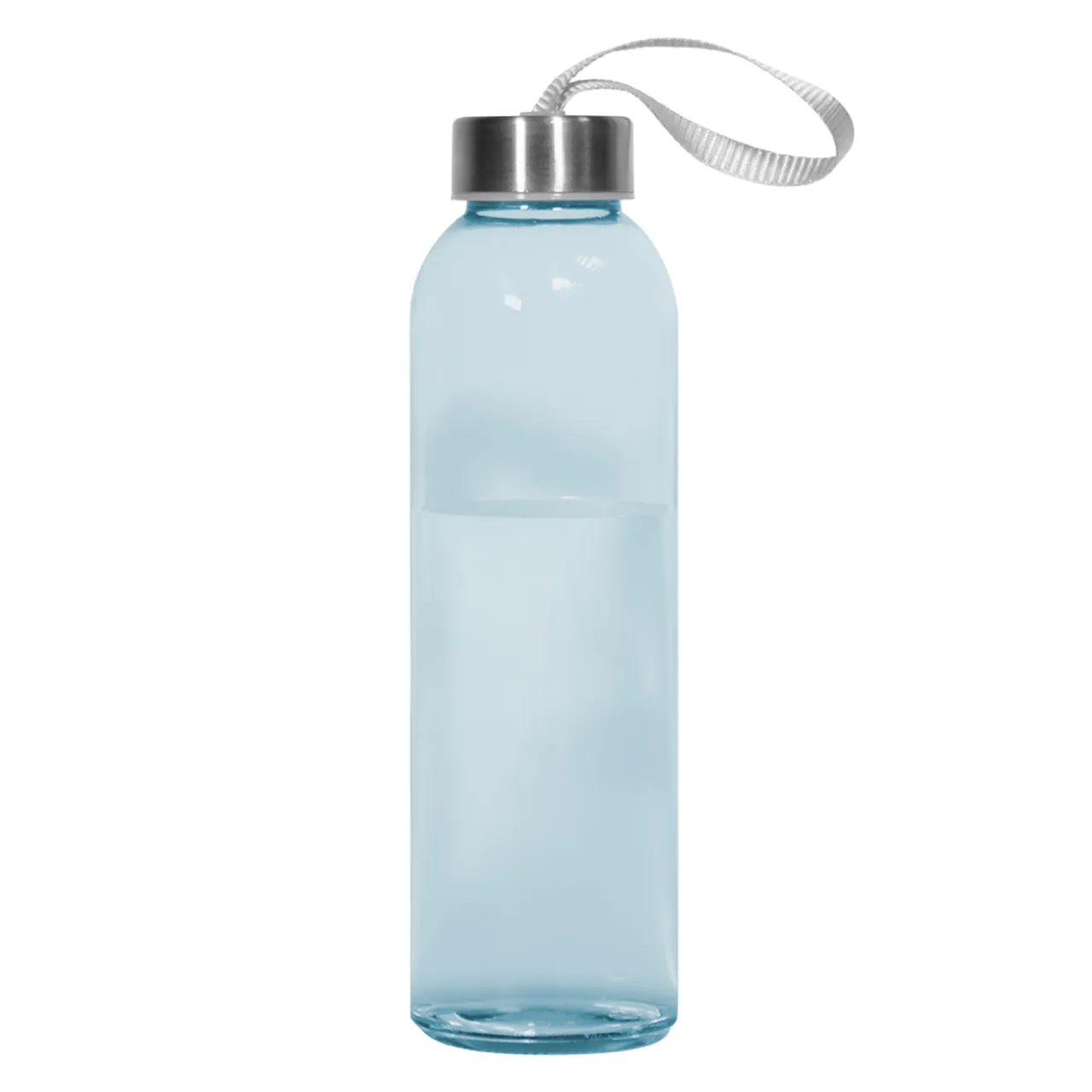 Ø 6,2 x 23 cm. Capacidad 500 ml. Vidrio resistente. Cuerpo traslúcido con tapa de acero inoxidable y tira color gris que permite transportarla. Presentación en caja de regalo.