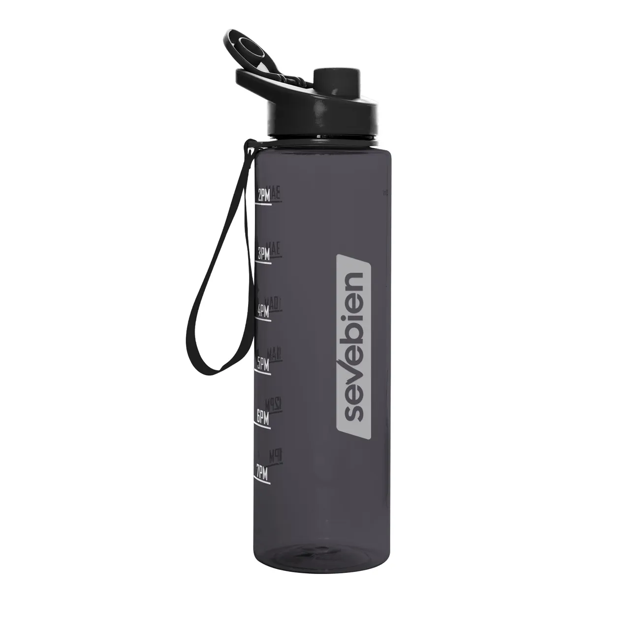 Tu meta en cada sorbo.Botella con marcador de tiempo y medida. Color translúcido con tapa plástica flip top con asa, boquilla y correa del mismo color de la botella.Medidas: Ø 7,5 x 27,5 cm. (con tapa)