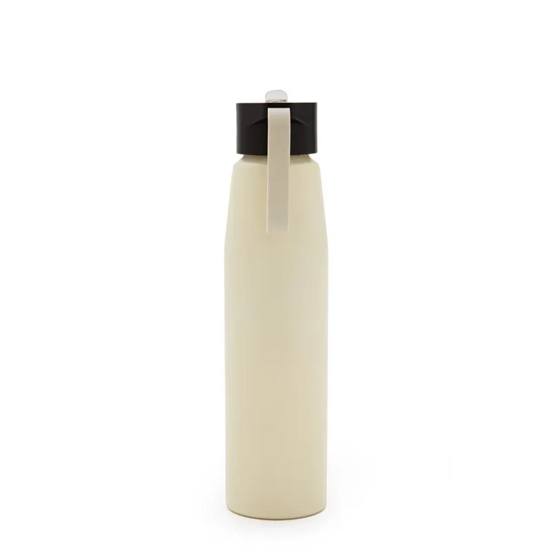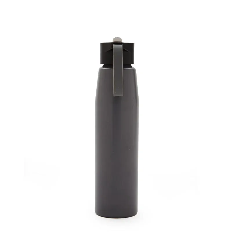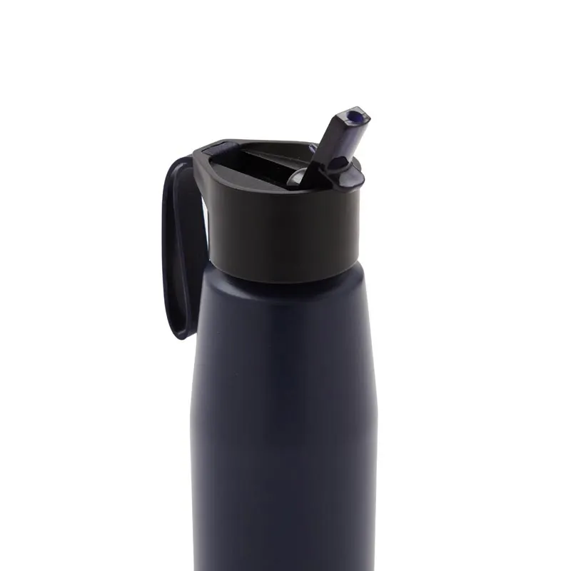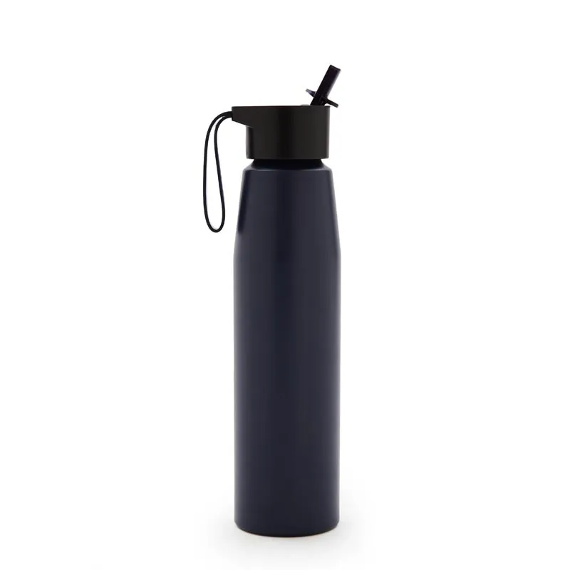 Botella de aluminio con tapa de PP negra a rosca con boquilla de PS y sorbete PE. Cuenta con una correa de silicona a tono con el color elegido para facilitar el agarre.