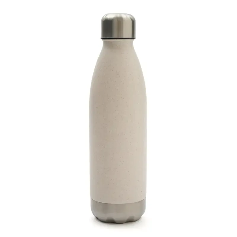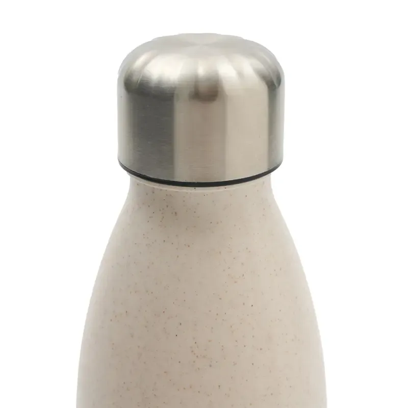 Botella confeccionada en PE (polietileno), wheat straw, pasta de tallo de trigo, un material sustentable que reduce el consumo de plásticos vírgenes, y acero inoxidable en su base y tapa, ofrece una alternativa resistente y ecológica para el día a día.
