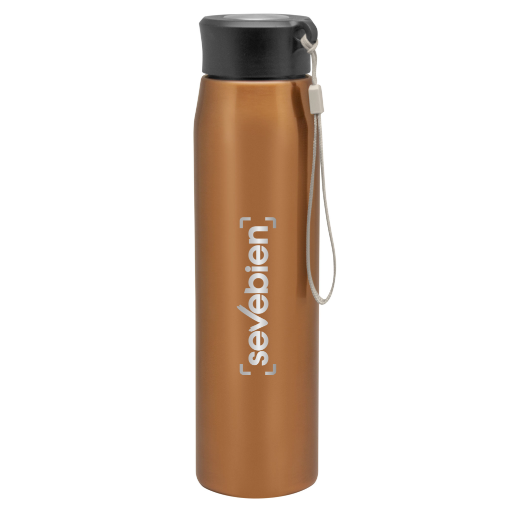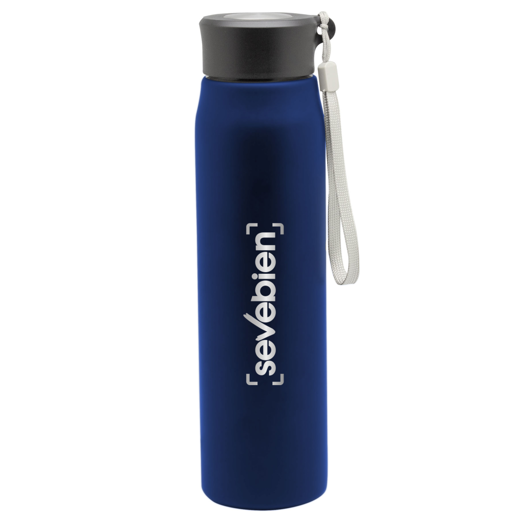 Ø 6,5 x 25 cm. Capacidad 800ml. Acero inoxidable. Botella de acero inoxidable 304. Tapa combinada en plástico y acero inoxidable 201 con tira de color gris de 12 cm de largo. Ideal para llevarla a todos lados. Presentación en caja de regalo.