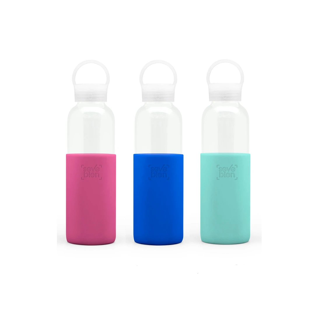 Ø 6,5 x 24 cm. Capacidad 500 ml. Vidrio de borosilicato. Botella práctica y reutilizable. Posee manga de silicona antideslizante en varios colores y pico ancho. Tapa a rosca, antiderrame y con manija de agarre. Presentación en caja de regalo.
