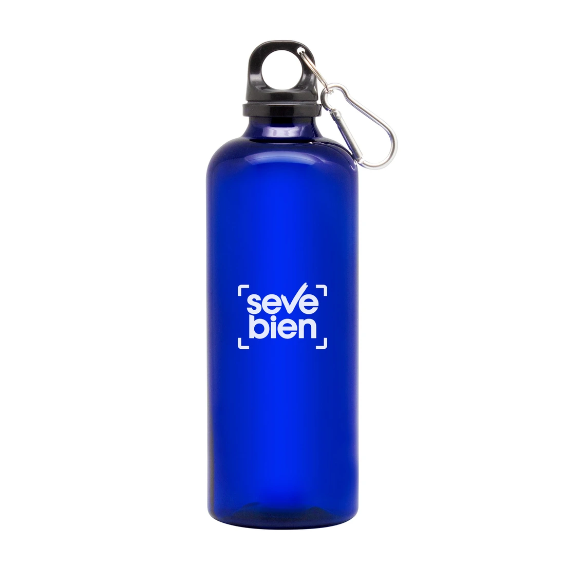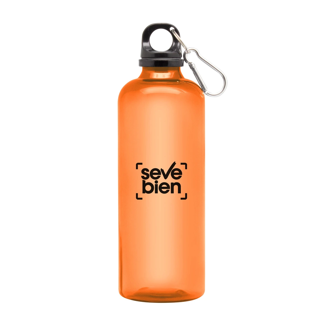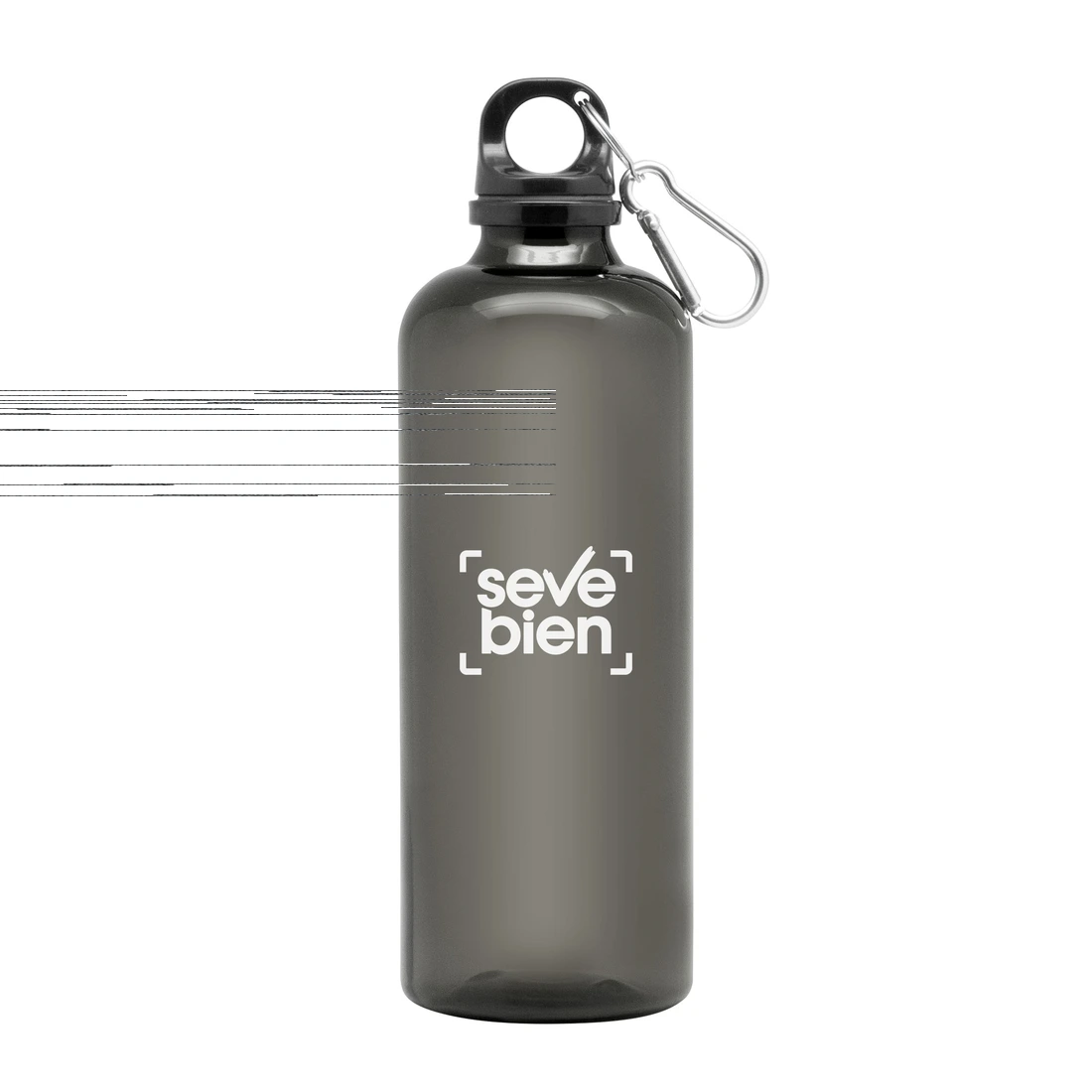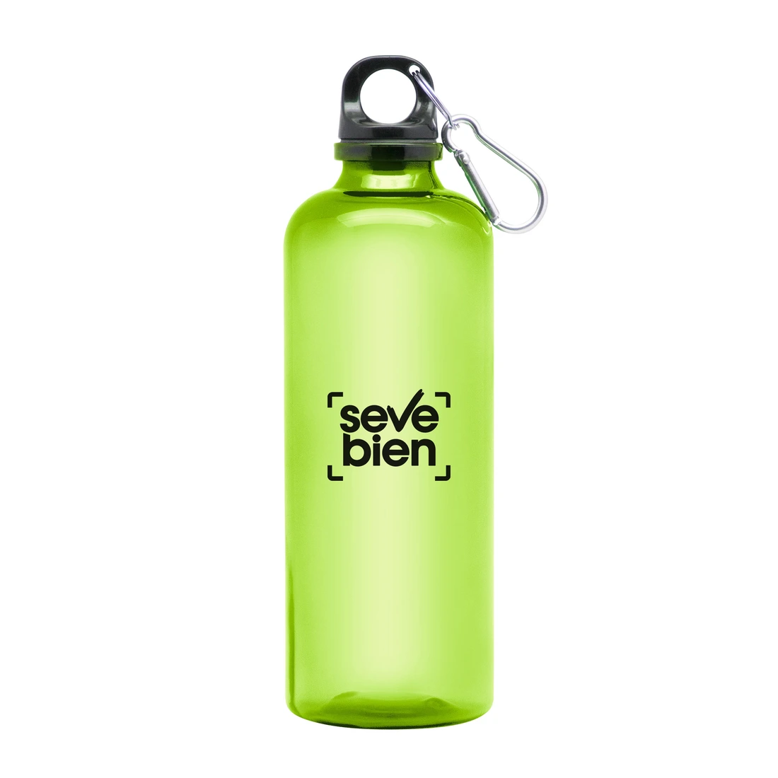 Ø 7 x 23 cm. Capacidad 600 ml. Material PET. Botella de plástico de colores translúcidos. Tapa a rosca en color negro con anillo de silicona y mosquetón de aluminio plata. Ultra liviana, pesa 60g.ATENCIÓN No utilizar con bebidas gaseosas ni líquidos calientes. / El manejo de este producto es delicado. / No exponer al sol y temperaturas altas por tiempo prolongado.