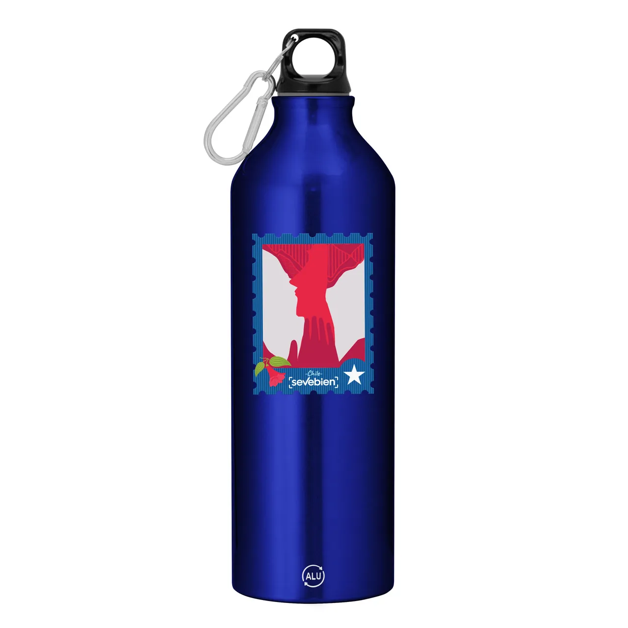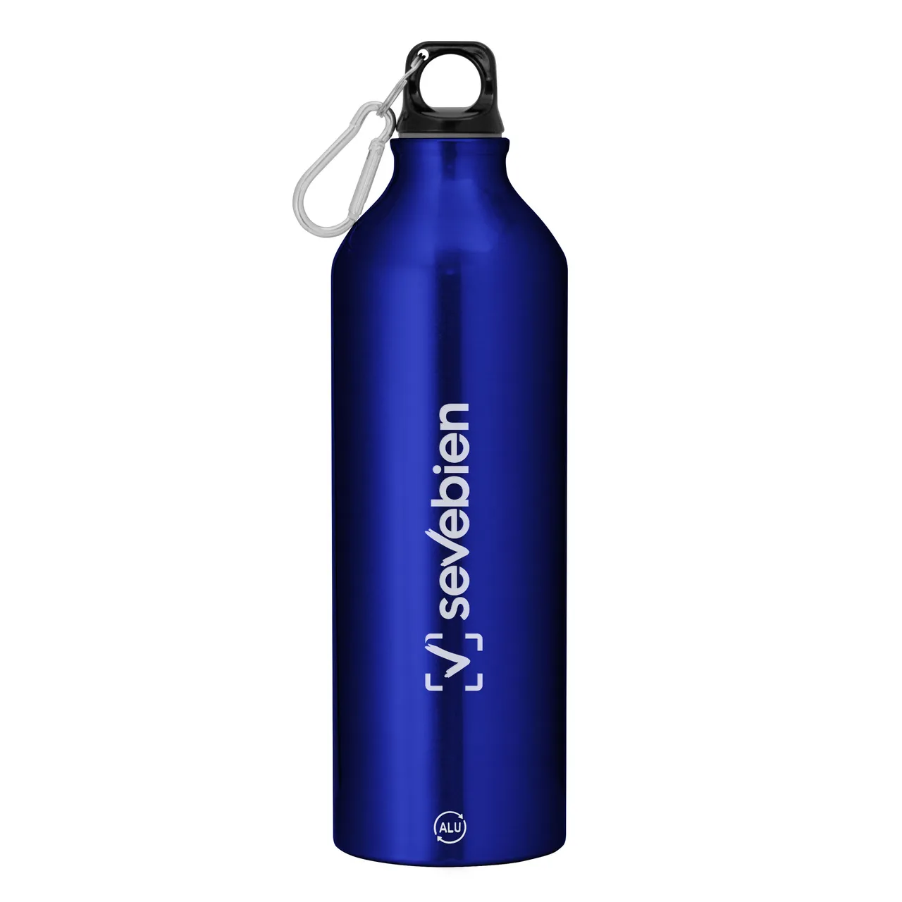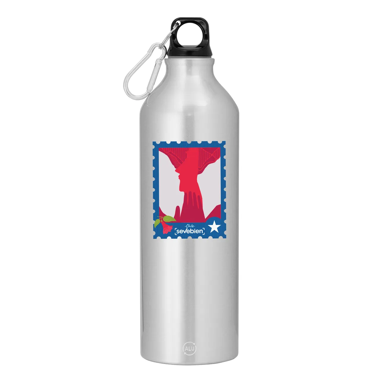 Fácil de llevar a todas partes.Botella de aluminio reciclado. Tapa a rosca plástica con anillo de silicona y con mosquetón (gancho carabinero) en color plateado.Medidas: Ø 7,2 x 25,5 cm.