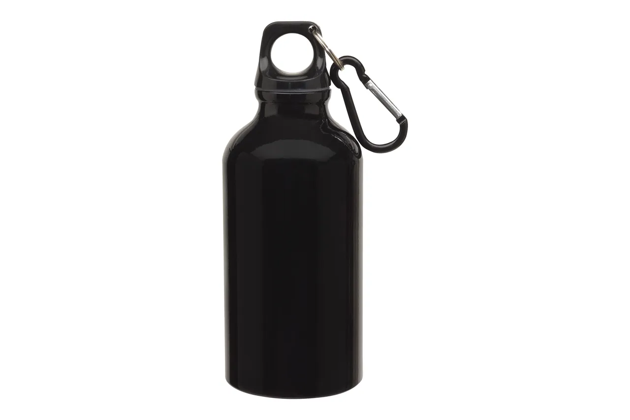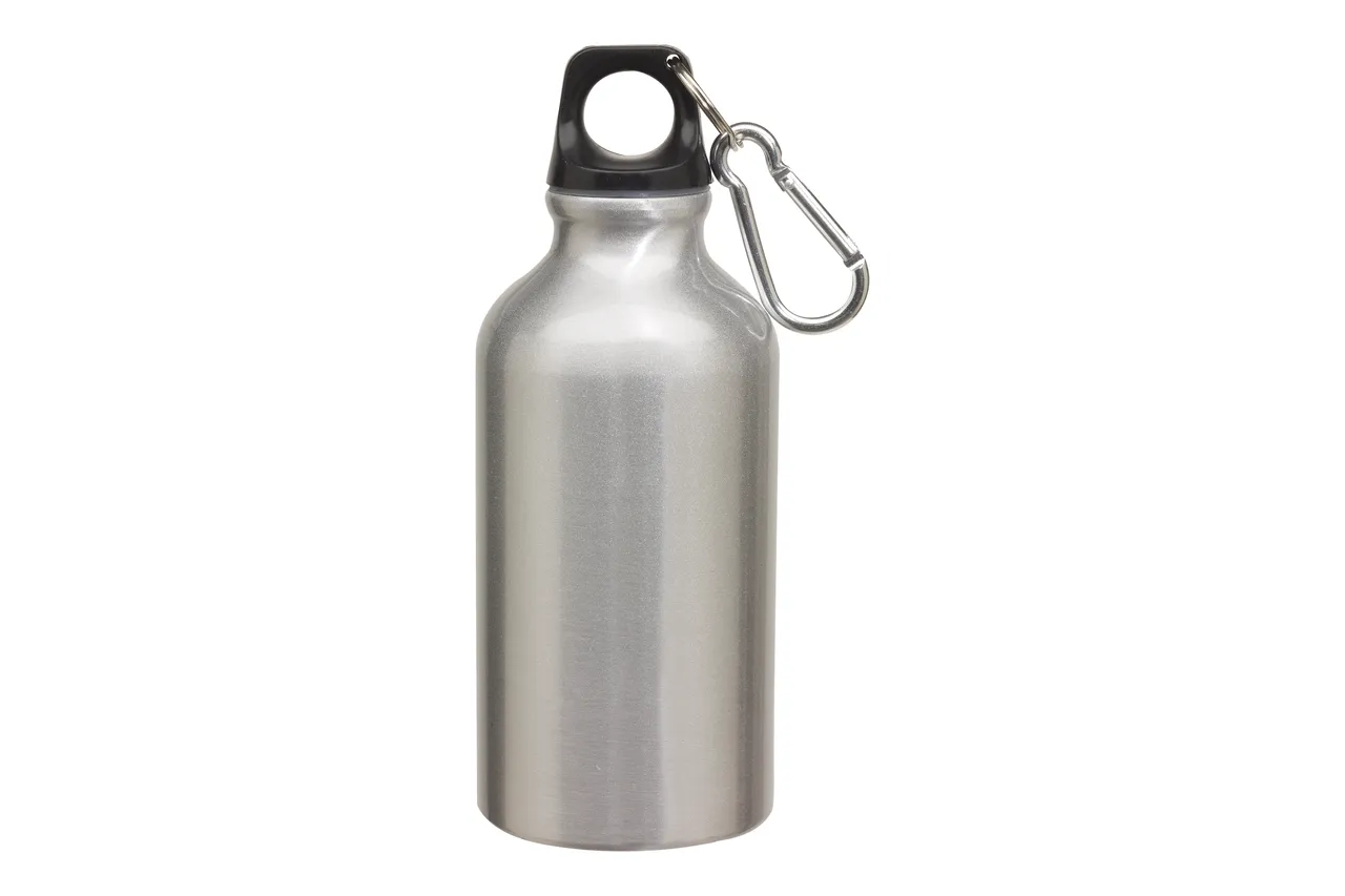 Ø 6,5 x 17,5 cm. Capacidad 400 ml. Aluminio. Botella de aluminio con cierre de plástico y carabina metálica.