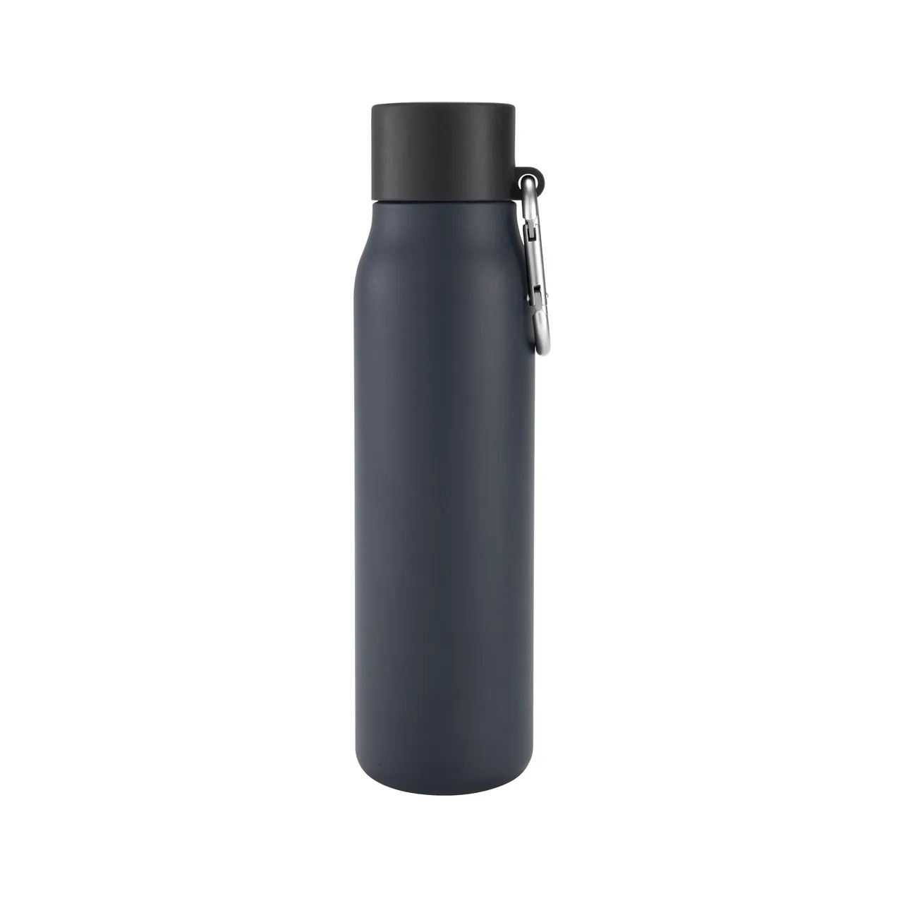 Acero reciclado, resistencia aseguradaBotella doble pared, sellada al vacío. Interior en acero 304 reciclado y exterior en acero 201. Pintura powder coat (pintura más duradera y resistente a la corrosión y el paso del tiempo). Tapa plástica de polipropileno y anillo de silicona con mosquetón de aluminio. Mantiene hasta 12 hs la temperatura de las bebidas calientes y hasta 24 hs la de las bebidas frías. Medidas: Ø 6,5cm x 25 cm.