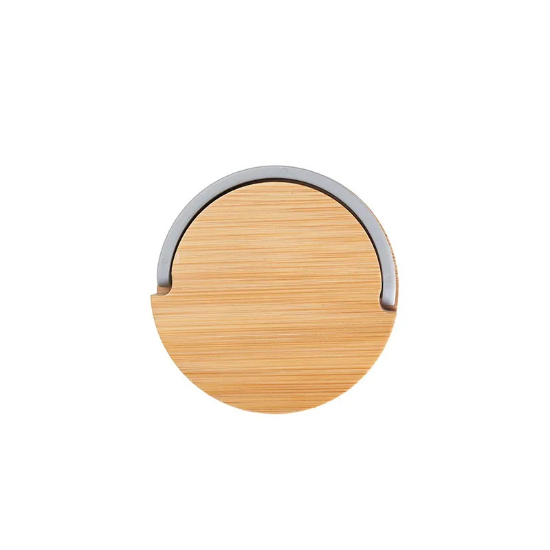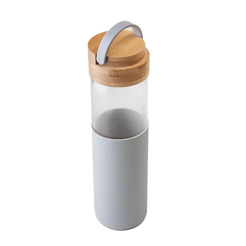 Botella reutilizable de vidrio, con tapa de bamboo y funda de silicona. Cuenta con un agarre en su tapa para su transporte. Producto libre de BPA.