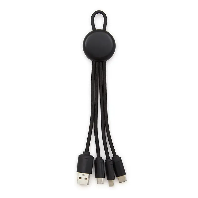 Cable 3 en 1 color negro, blanco o gris, con una longitud de 17 cm. Es el accesorio perfecto para mantener tus dispositivos siempre cargados y listos para usar. Incluye un cable de entrada USB A y 3 de salida TIPO C / LIGHTING / MICRO B, lo que te permite cargar dispositivos con diferentes tipos de entradas. Realizado en plástico reciclados: RABS y RTPE. ReUseMe