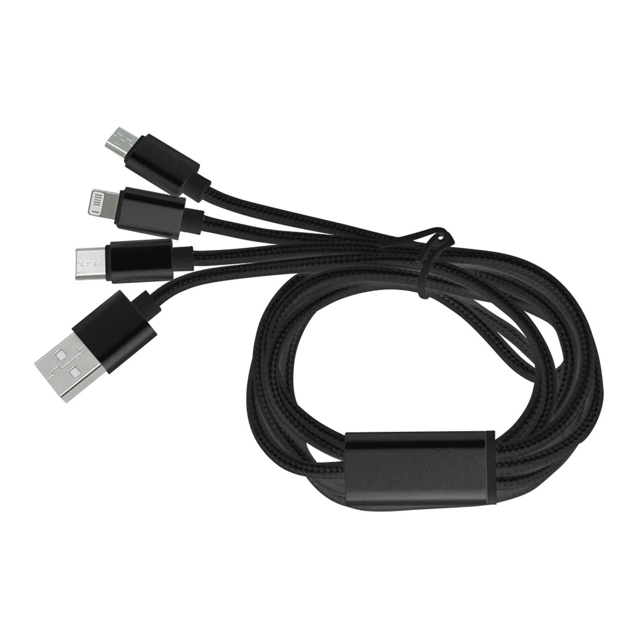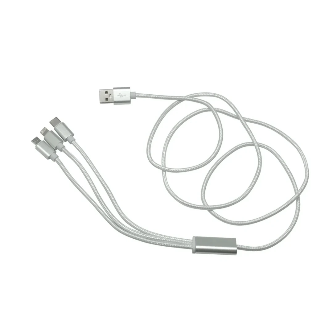 120 cm. Aluminio y Nylon. Cable con entrada USB y diferentes adaptadores: Iphone, Type C y Android. Viene dentro de una bolsa plásticas con cierre ziploc.