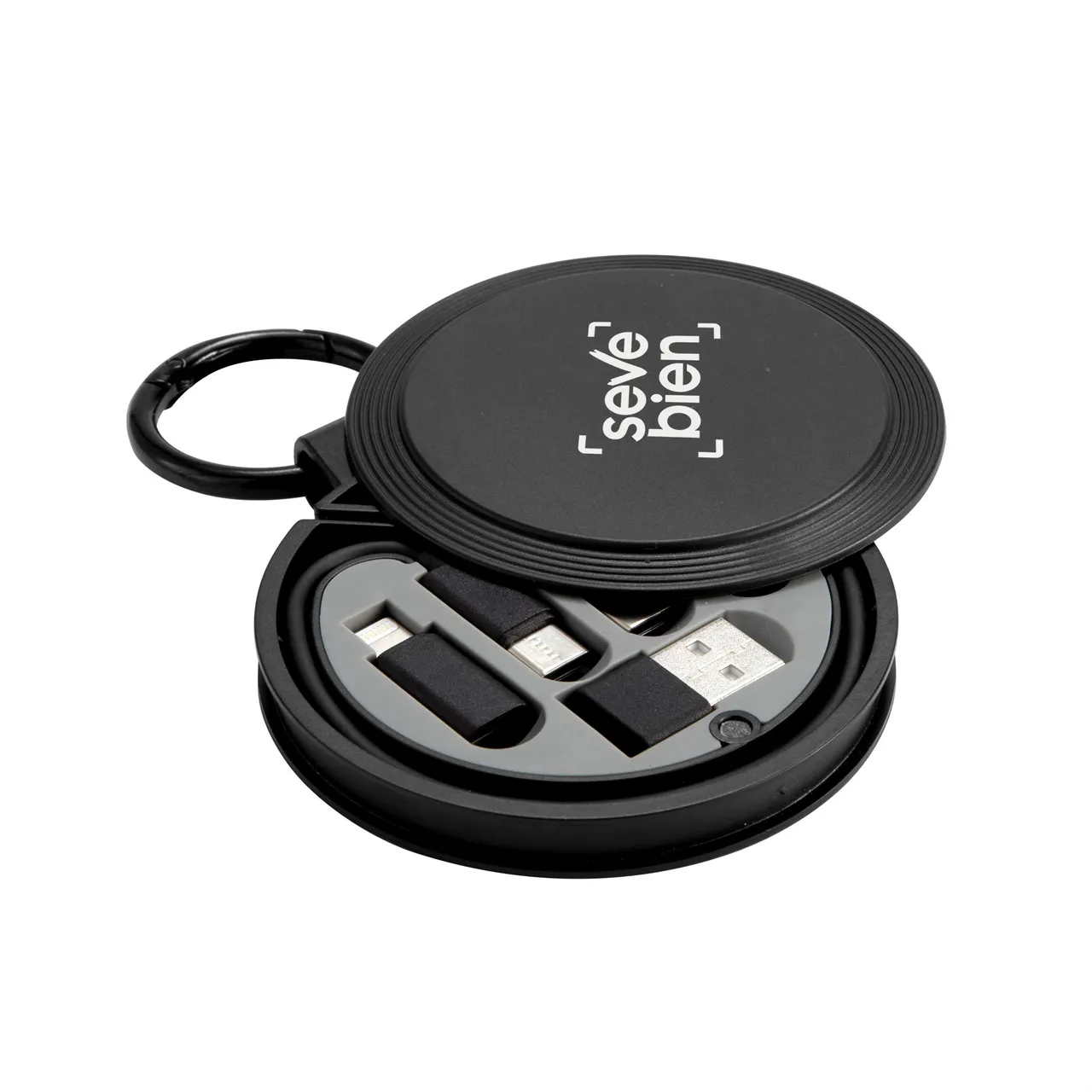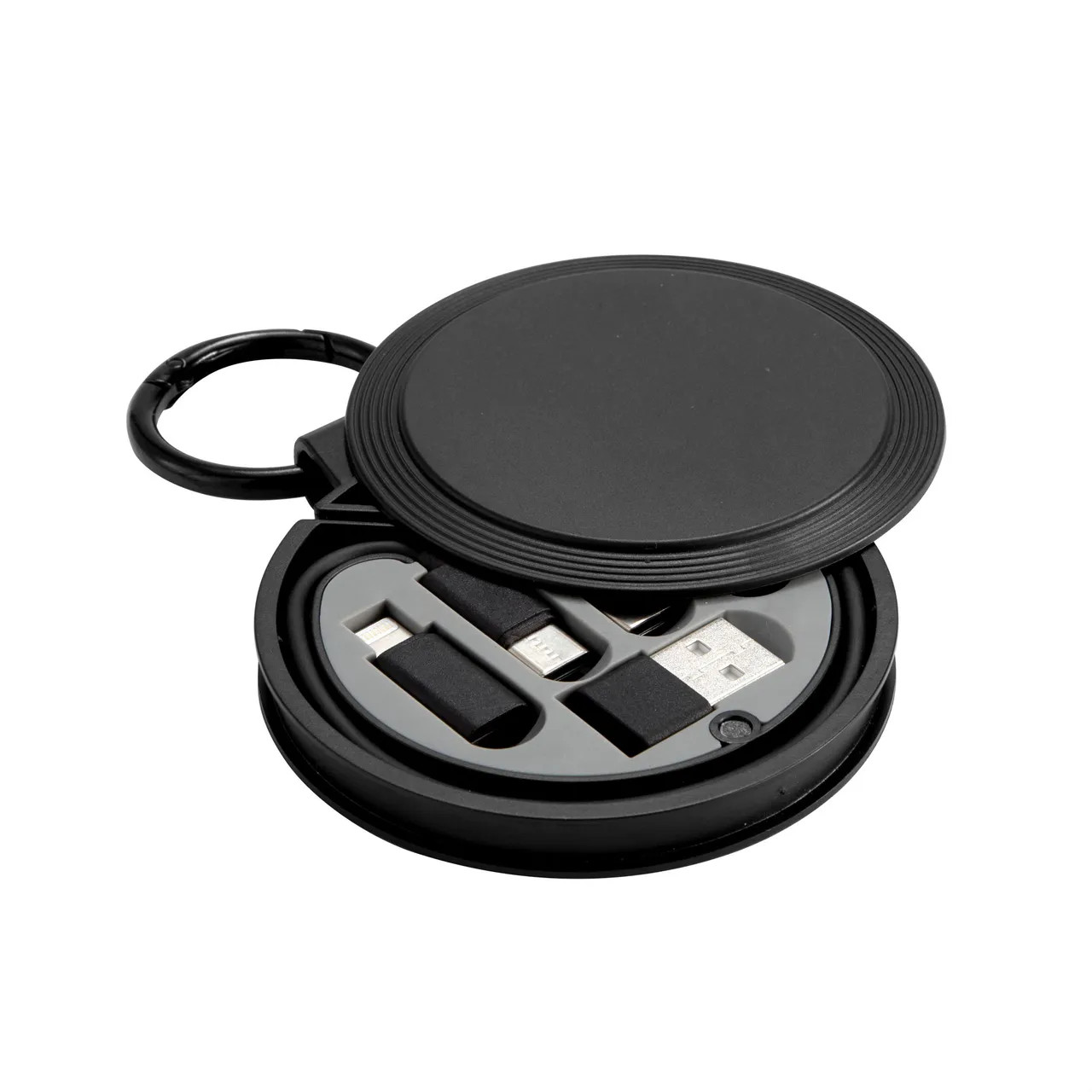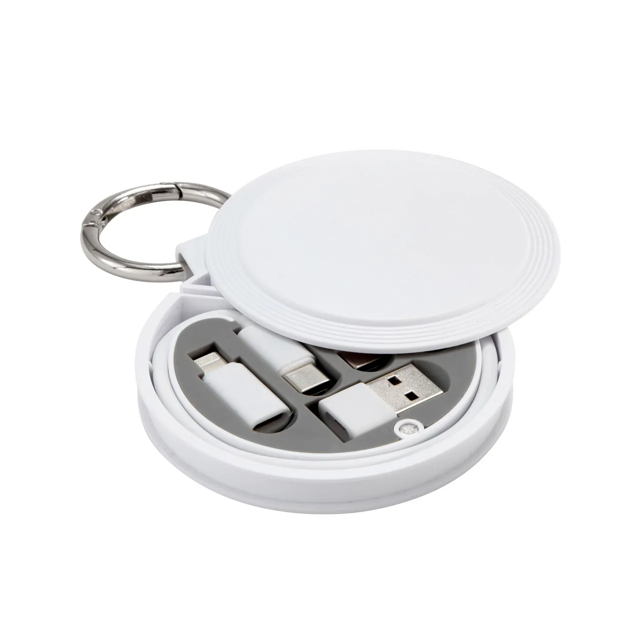 Un cable, todas las conexionesCable de carga rápida. Estuche circular con mosquetón. Accesorios: 1 cable de carga rápida USB tipo C a USB tipo C de 60 W con transferencia de datos, 1 adaptador USB standard, 1 adaptador Lightning y 1 adaptador micro USB. Cierre magnético. Apertura por deslizamiento.Medidas: Estuche de Ø 8 cm x 1 cm. Mosquetón anillo de Ø 4 cm x 0,4 cm. Cable de 26,5 cm. extendido.