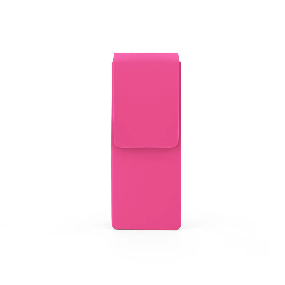 7,5 x 18,5 x 2,7 cm. Silicona. Cartuchera de silicona extra suave. Tiene una solapa imantada y es muy canchera para llevarla a todos lados. Presentación en caja de regalo.