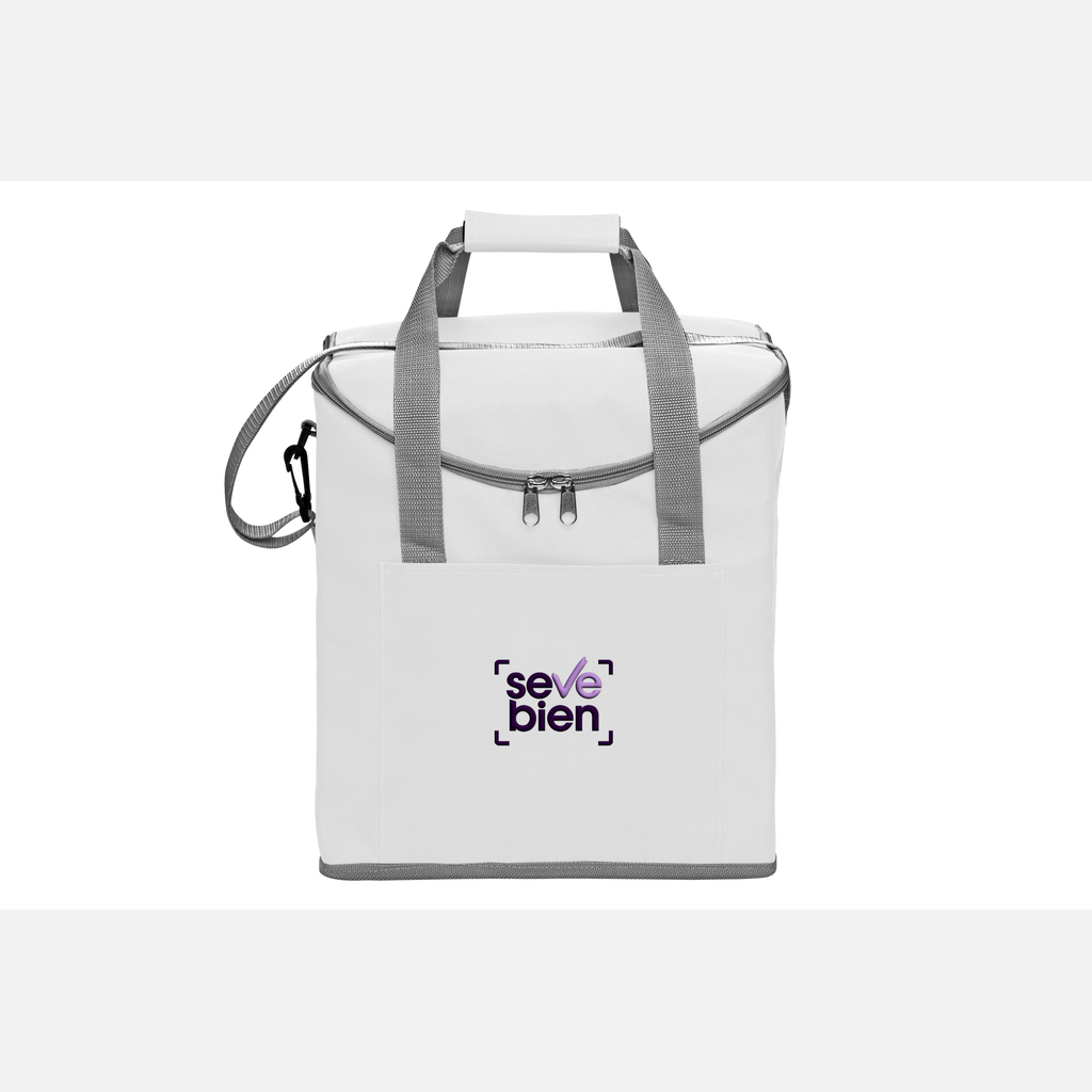 30 x 34 x 19,5 cm. Capacidad 37 litros. Poliéster. 600D Lonchera térmica con recubrimiento interior metalizado. Un bolsillo frontal y dos bolsillos laterales de red. Correa tipo bandolera y dos manijas reforzadas con cierre de velcro. Capacidad hasta 6 botellas de 2,5 litros