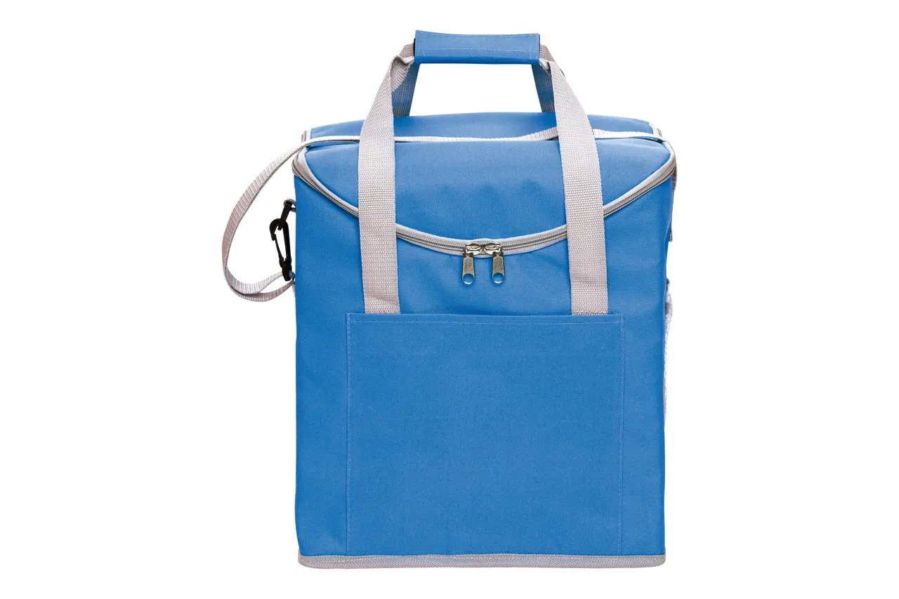 36,5 x 33 x 19,5 cm. Capacidad 37 litros. Poliéster. 600D Lonchera térmica con recubrimiento interior metalizado. Un bolsillo frontal y dos bolsillos laterales de red. Correa tipo bandolera y dos manijas reforzadas con cierre de velcro. Capacidad hasta 6 botellas de 2,5 litros