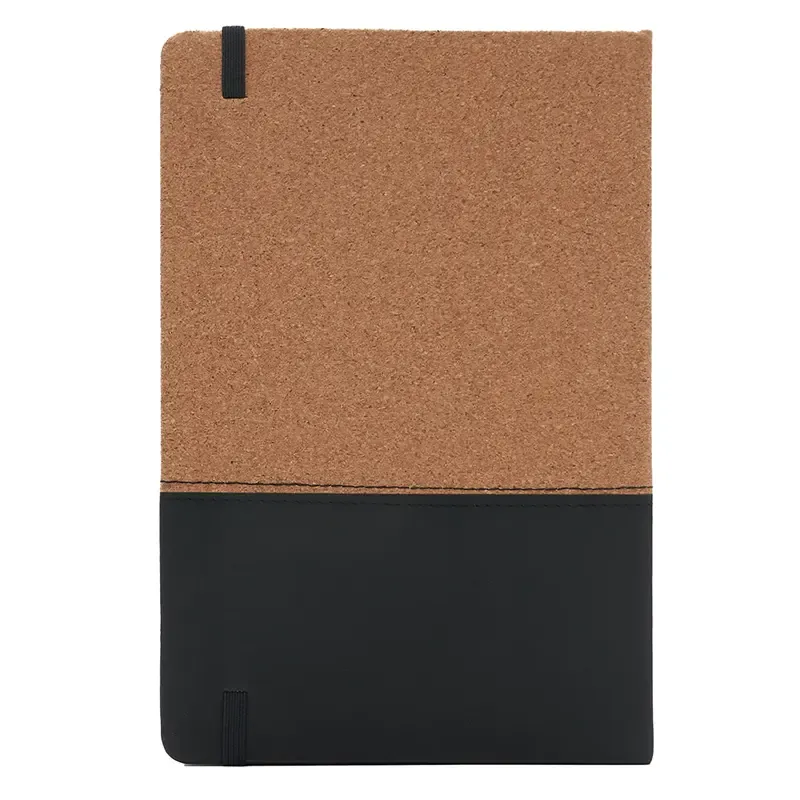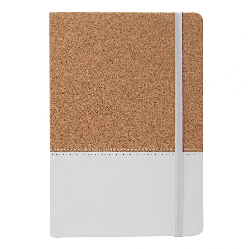Cuaderno con tapa de corcho y PU. Cinta marca página y elástico de cierre. 80 hojas rayadas. Medidas: 14,5 x 21 cm. ReUseMe.
