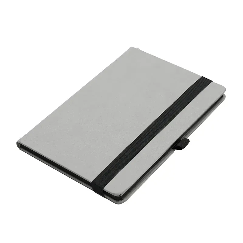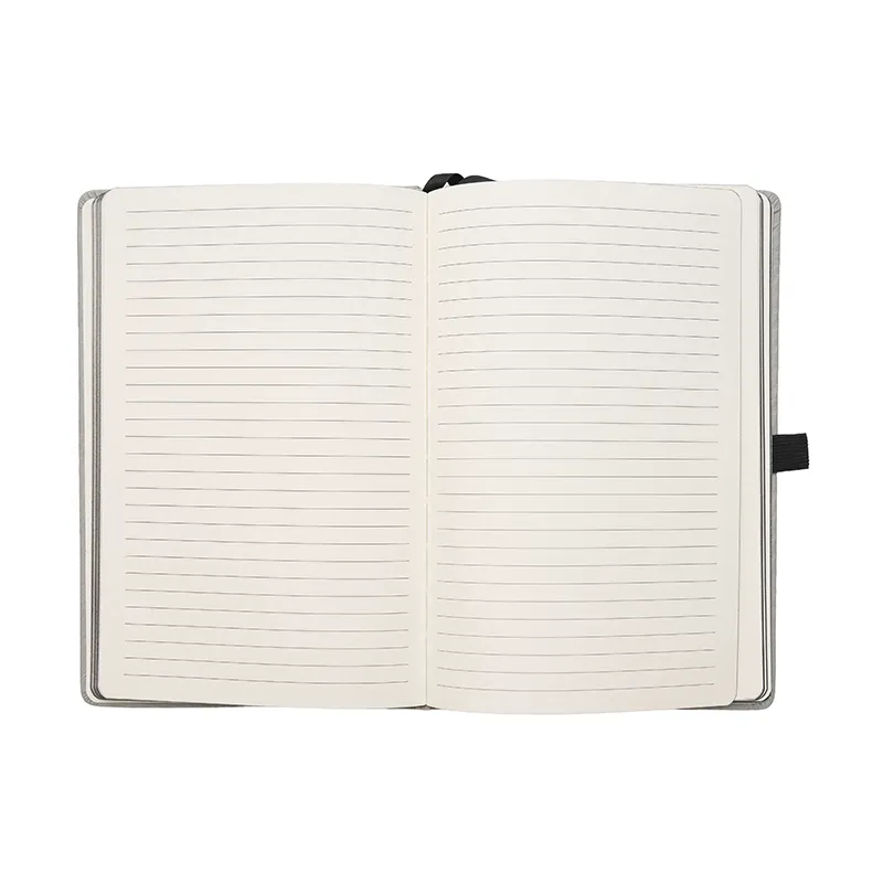 Cuaderno con tapa dura confeccionada en PU (poliuretano) color gris. Cuenta con 96 hojas rayadas de 70 g, perfectas para tomar notas, escribir ideas o planificar la jornada e incluye cinta señaladora.