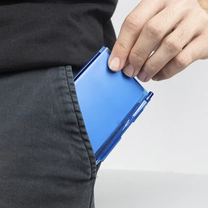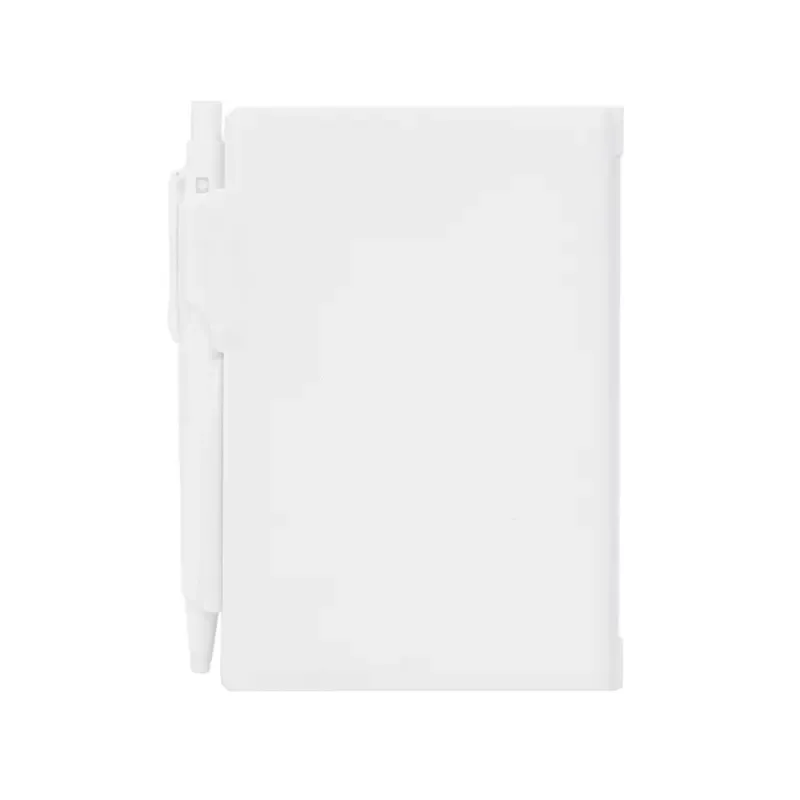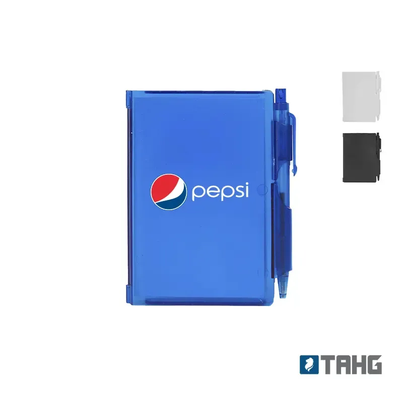 Cuaderno Plástico con tapa dura de PS y porta bolígrafo. 80 hojas lisas. Incluye bolígrafo. Medidas: 10,4 x 7,8 cm.