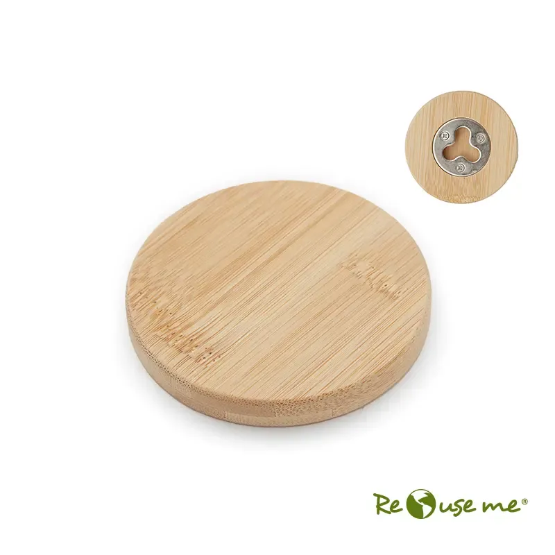Destapador abrebotellas circular fabricado en bambú y metal. Dimensiones: 6 cm. ReUseMe