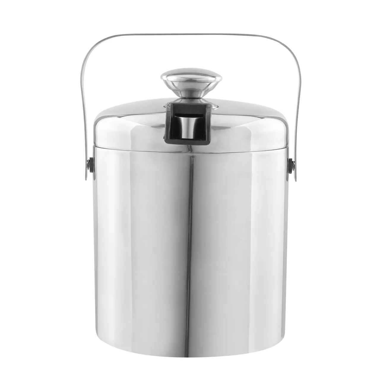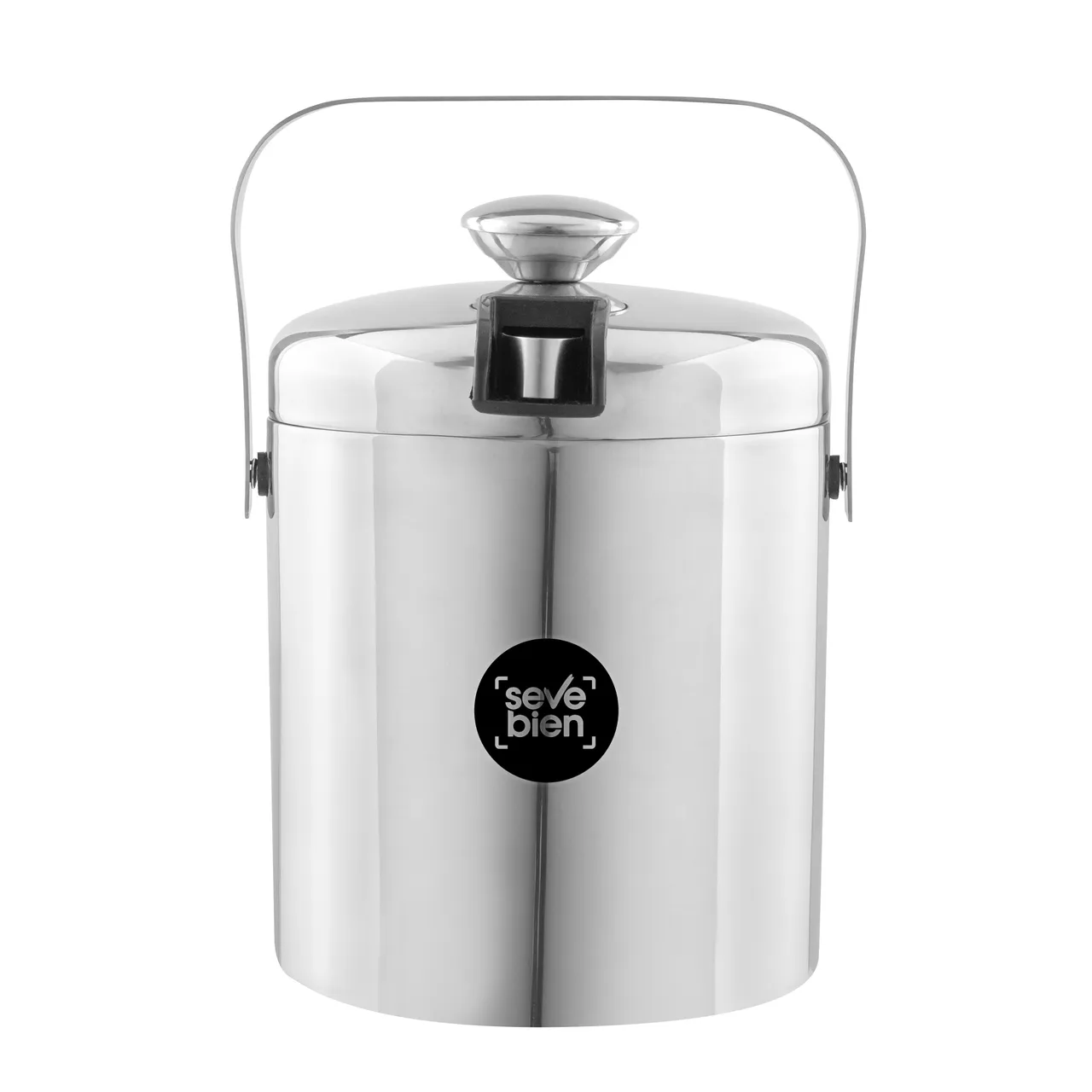 Ø 14 x 14 cm. Capacidad 1100 ml. Acero inoxidable. Interior en acero 304 y exterior en acero 201. Hielera de mesa con tapa. Pinza para hielo de acero inoxidable, encastrable en la misma tapa. Asa de acero inoxidable para transportar. Presentación en caja de regalo kraft.