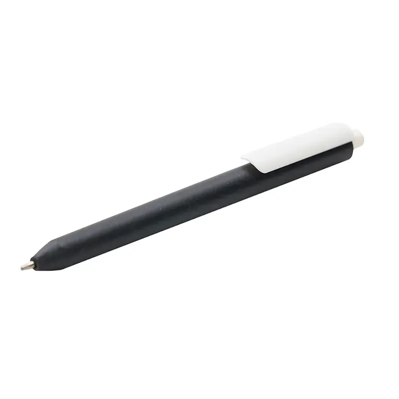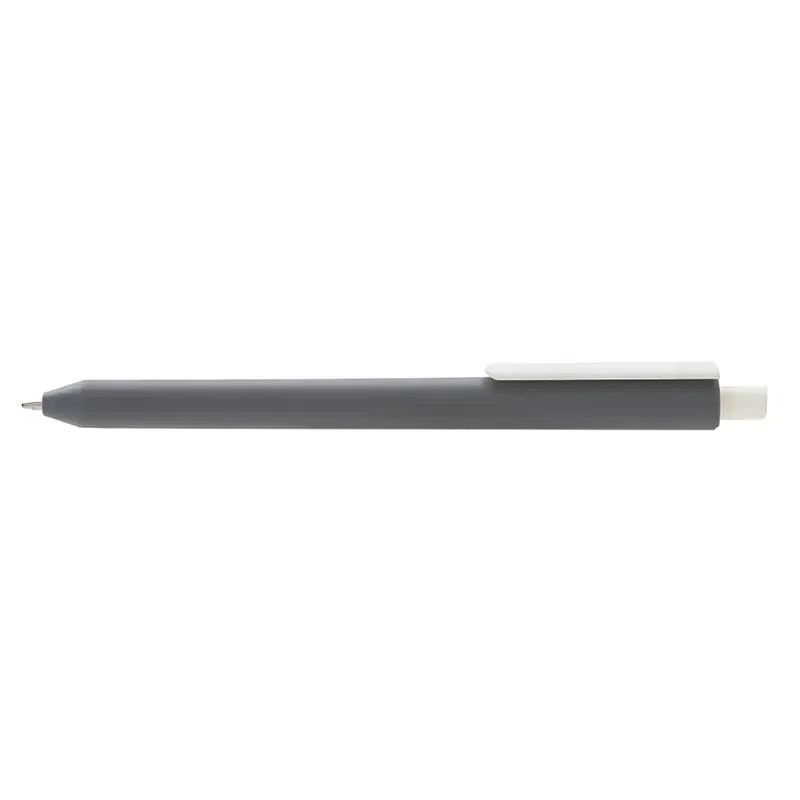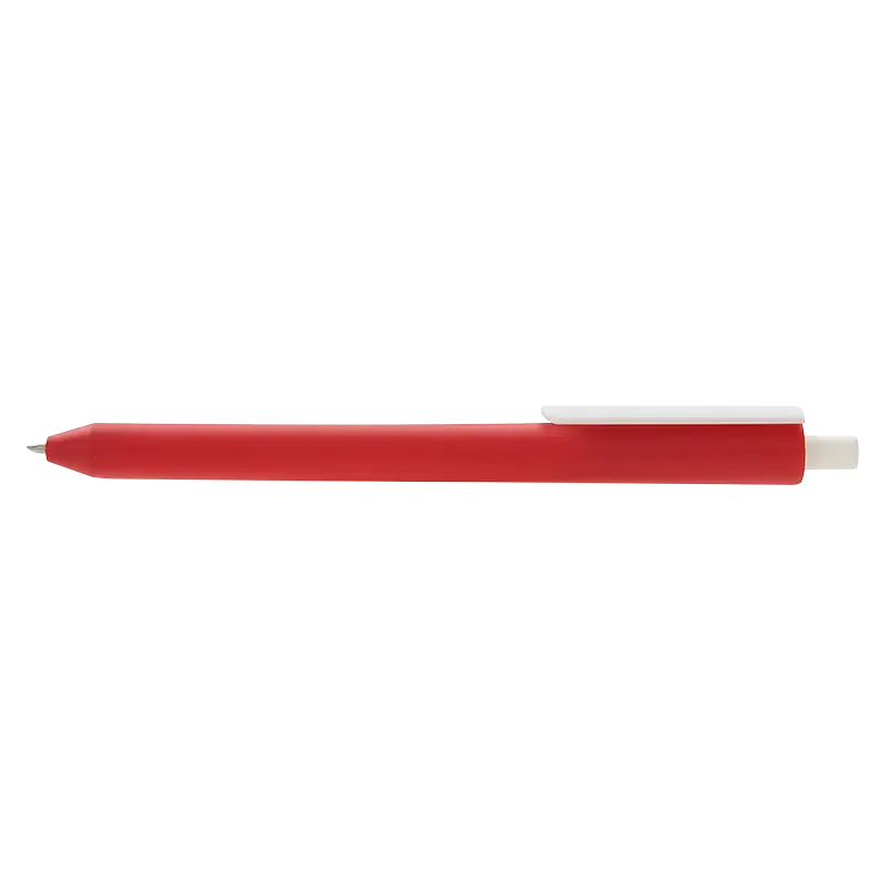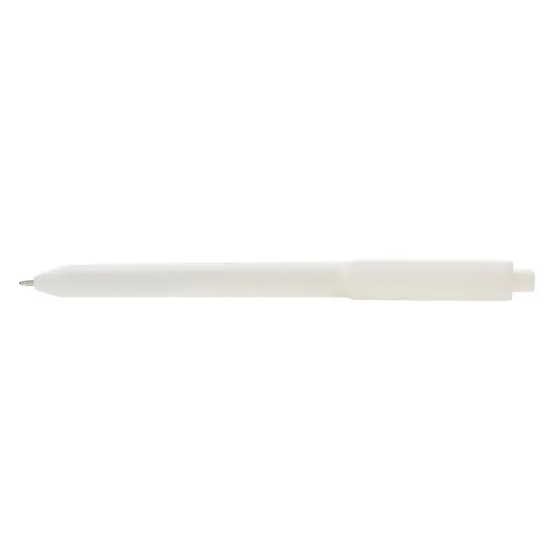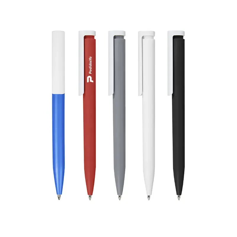 Lápiz confeccionado en ABS, con clip en color blanco. Apertura con pulsador retractil. Tinta azul.