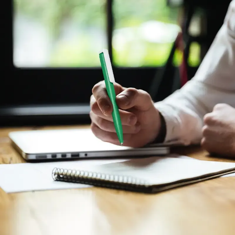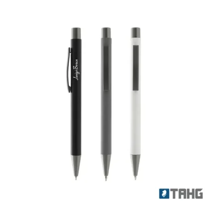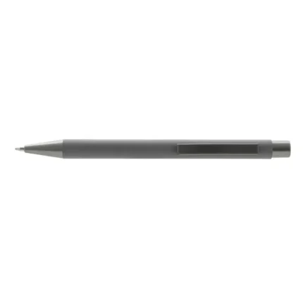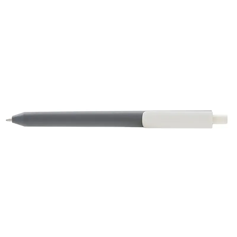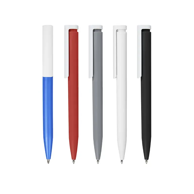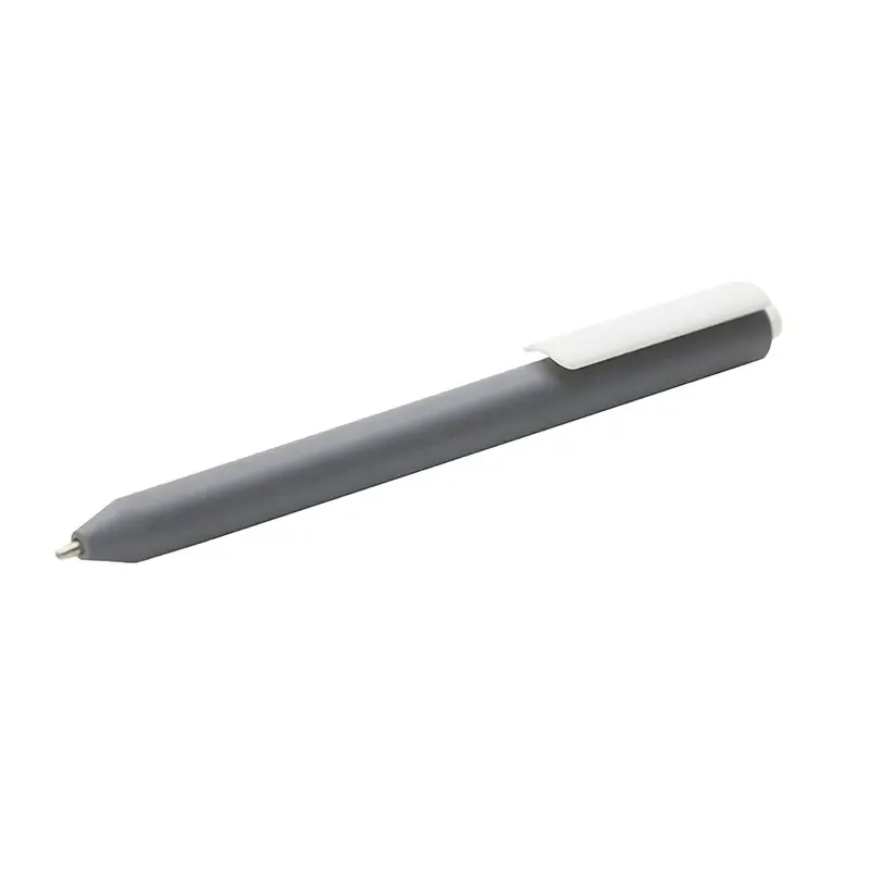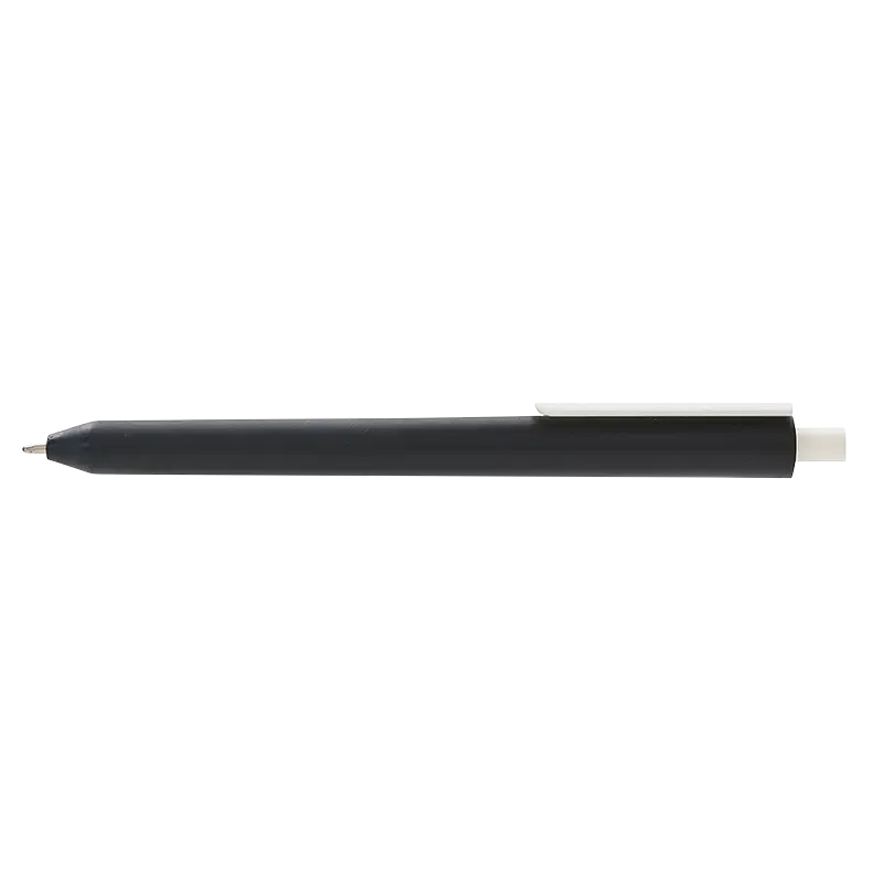 Lápiz confeccionado en ABS, con clip en color blanco. Apertura con pulsador retractil. Tinta azul.