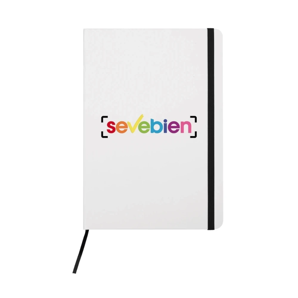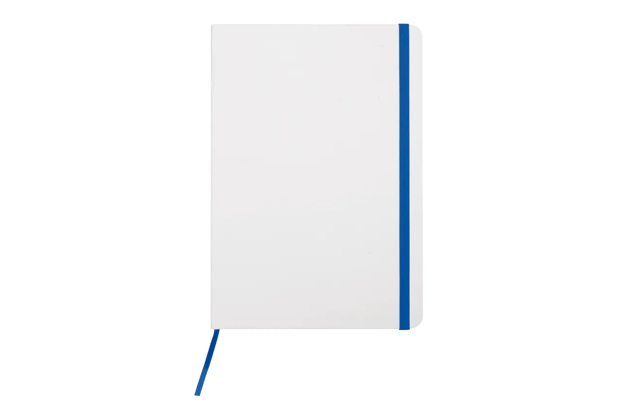 21 x 14,5 x 1 cm. Cartón. Libreta de tapa dura color blanco. Contiene 80 hojas rayadas, señalador y cierra con banda elástica del mismo color.