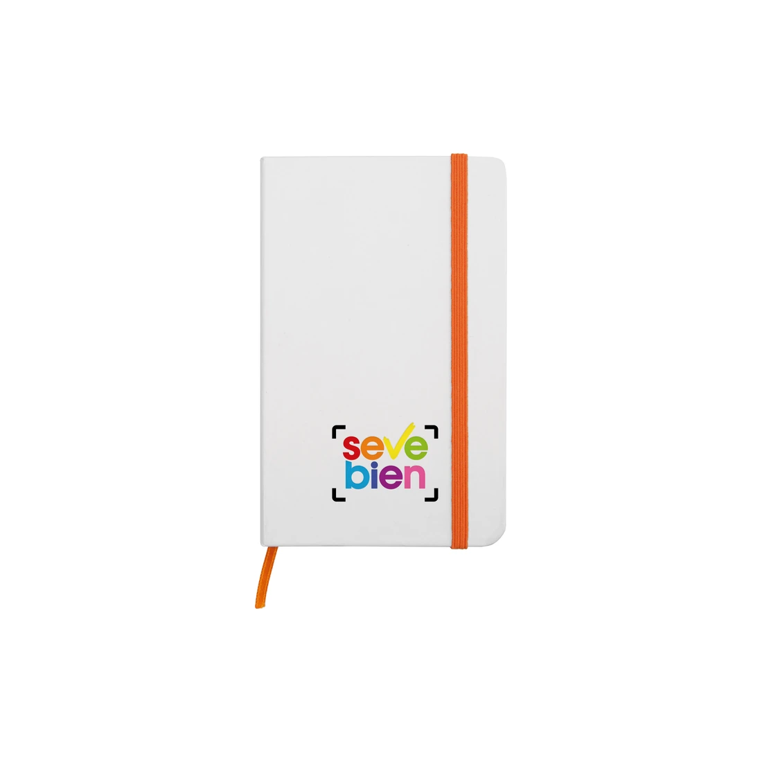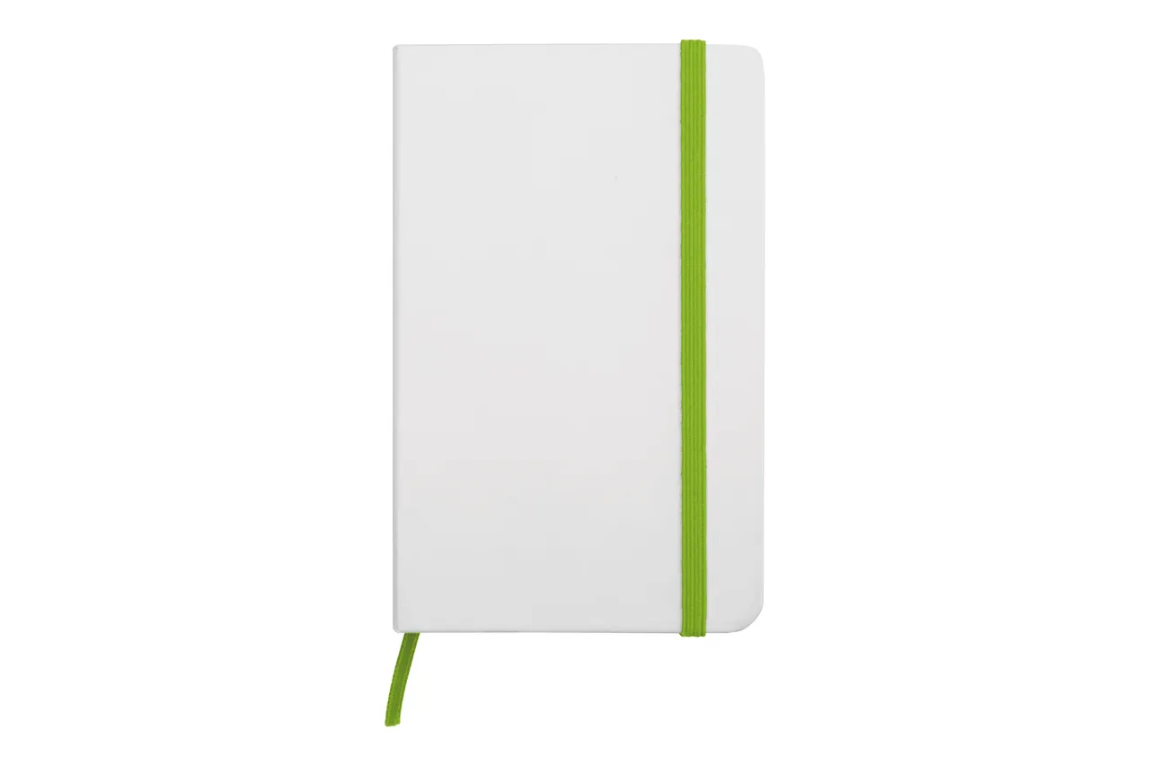 14,3 x 9,2 x 1,1 cm. Cartón. Libreta de tapa dura color blanco. Contiene 80 hojas rayadas, señalador y cierra con banda elástica del mismo color.