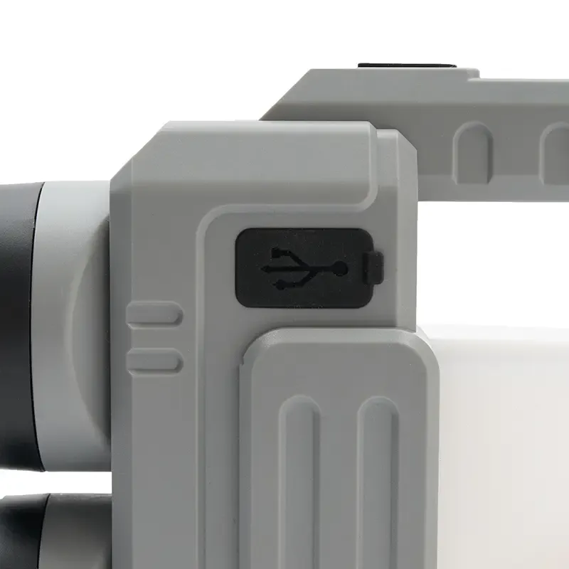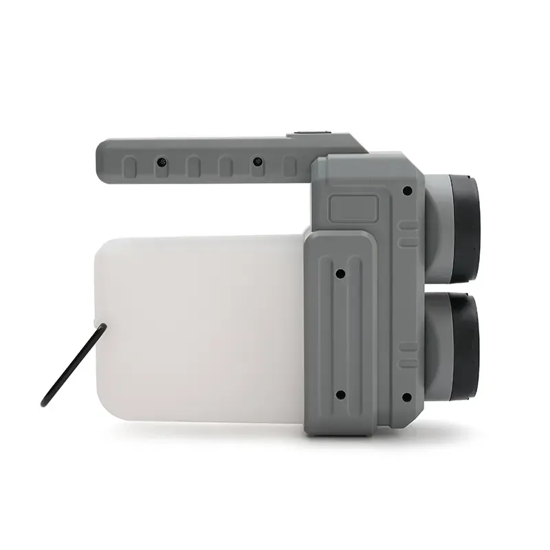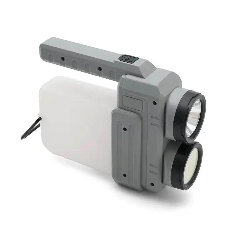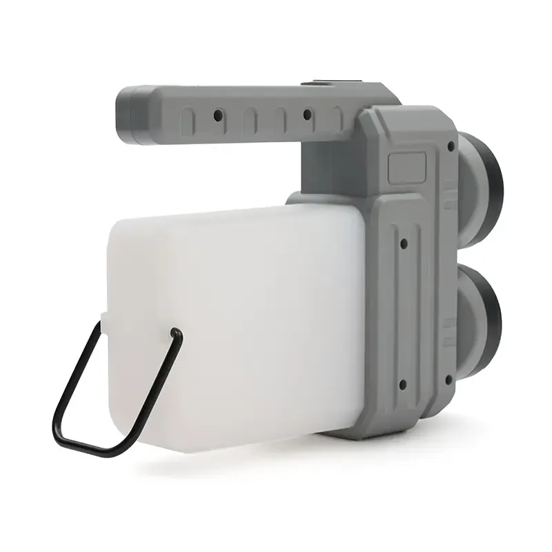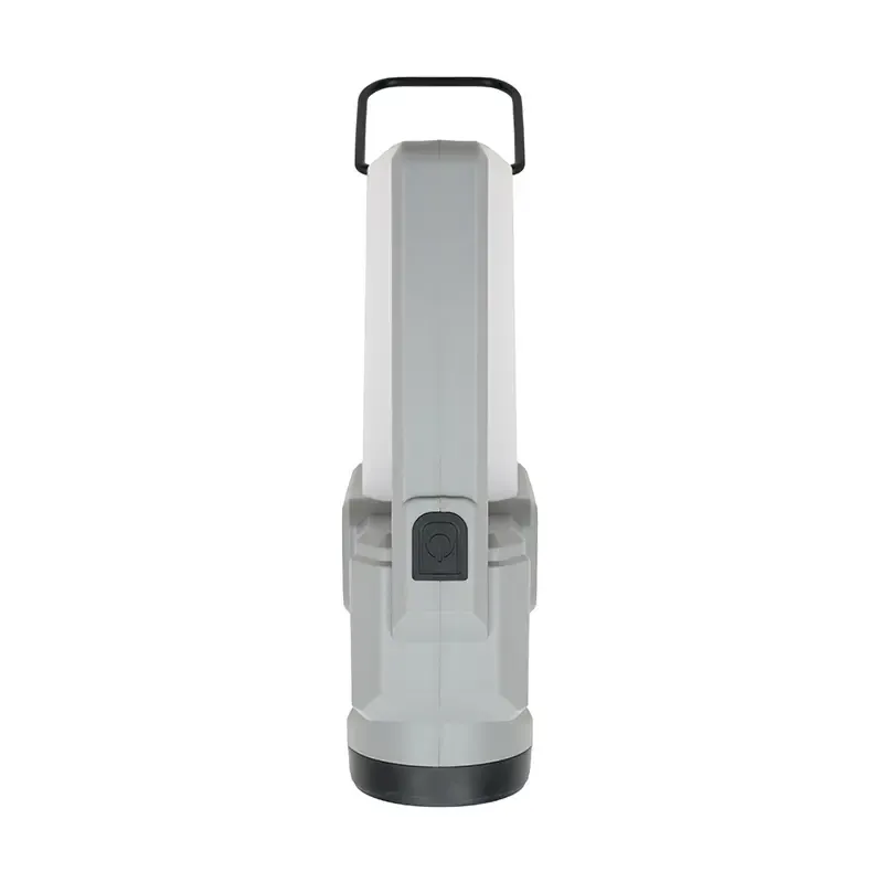 Lámpara fabricada en ABS + PP. Su diseño versátil ofrece dos tipos de agarre: una manija ergonómica para un mejor control en modo linterna y una manija tipo «cuerda», ideal para colgar y utilizar como farol.