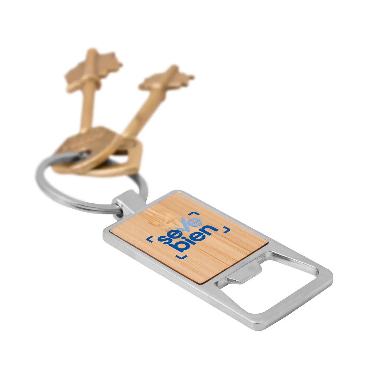 Funcionalidad y estilo.Llavero con destapador abre botellas. Estructura metálica con aleación de zinc con acabado brillante y panel frontal de bambú barnizadoMedidas: 6 x 3,2 x 3,5 cm.