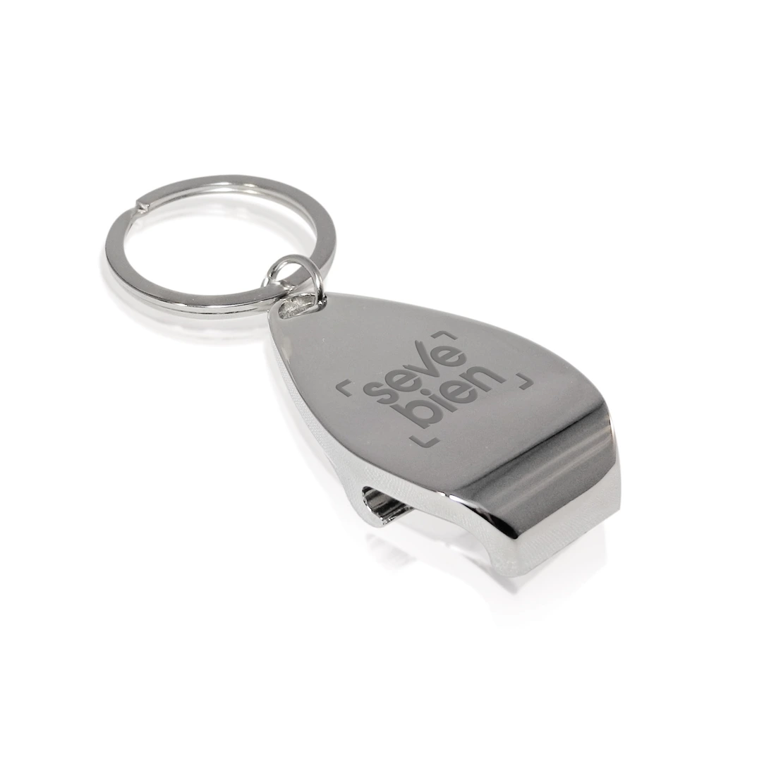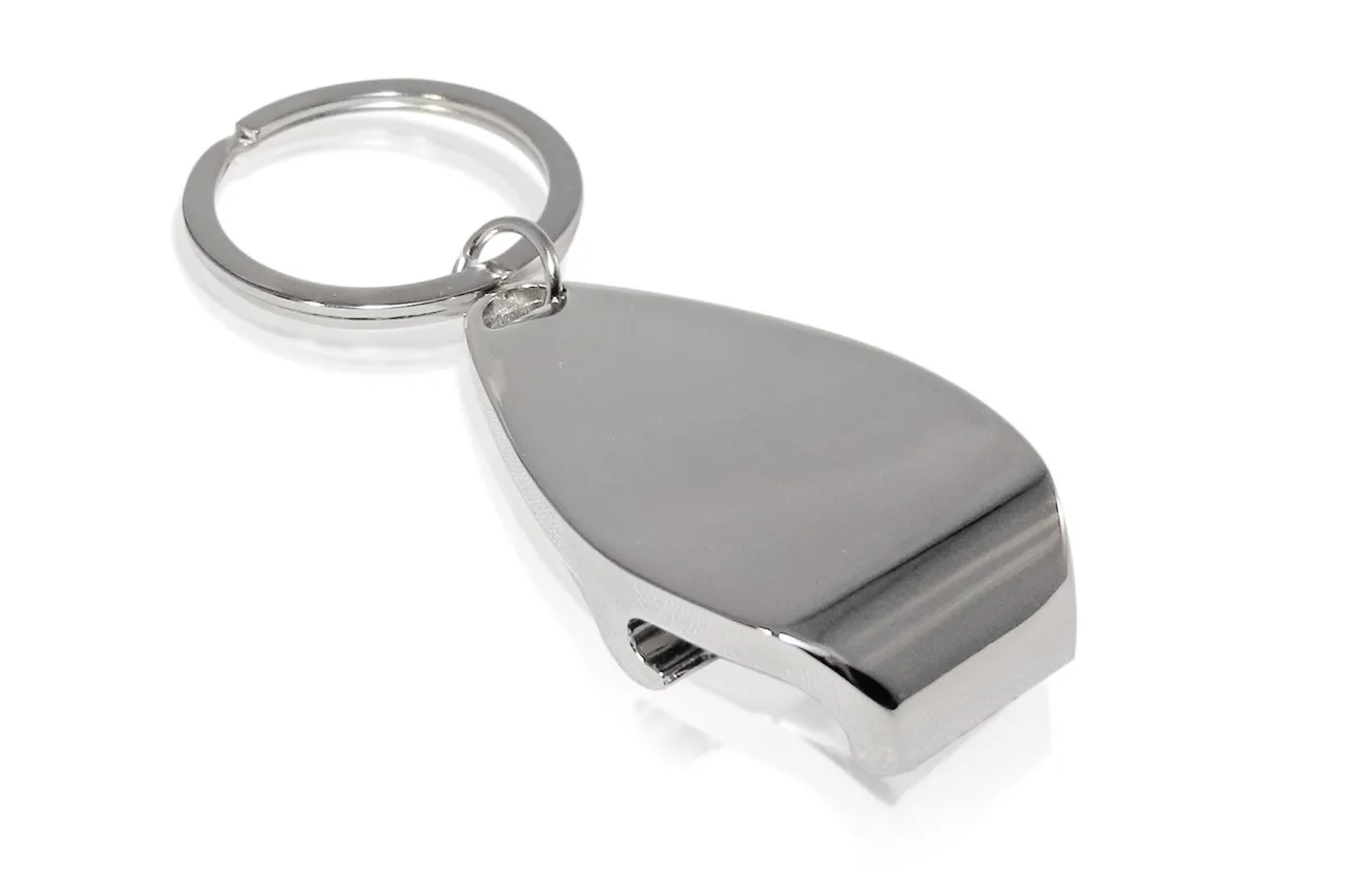 2,8 x 1 x 5 cm Metal. Llavero plano que se puede usar como destapador. Presentación en caja de regalo.